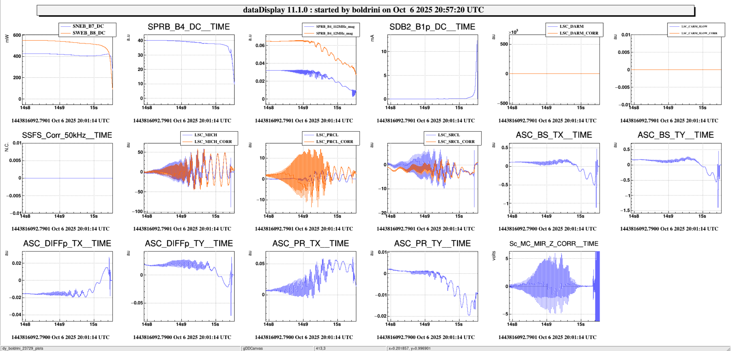 PRCL, MICH, SRCL and several AA loops experience a very fast oscillation (400 Hz), further modulated by another one at 60 Hz over a few tenths of a second. The same oscillation is visible on the Z correction of the IMC.