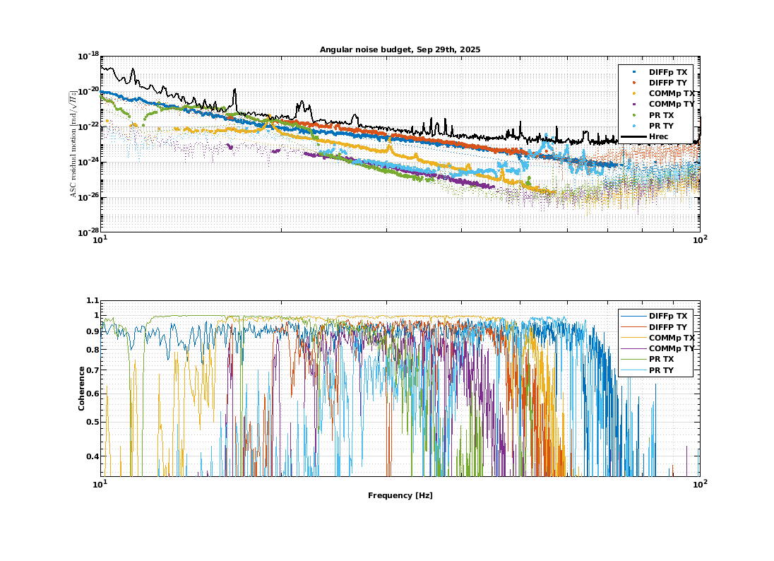 Here the computation of the angular noise budget computed with the injections done on 29 September: all couplings look higher than in the recent past, especially DIFFp (both) and PR_TX, which looks impacting at low frequency. To be noted that this measurement was done before the recent PR MAR rebalancing.