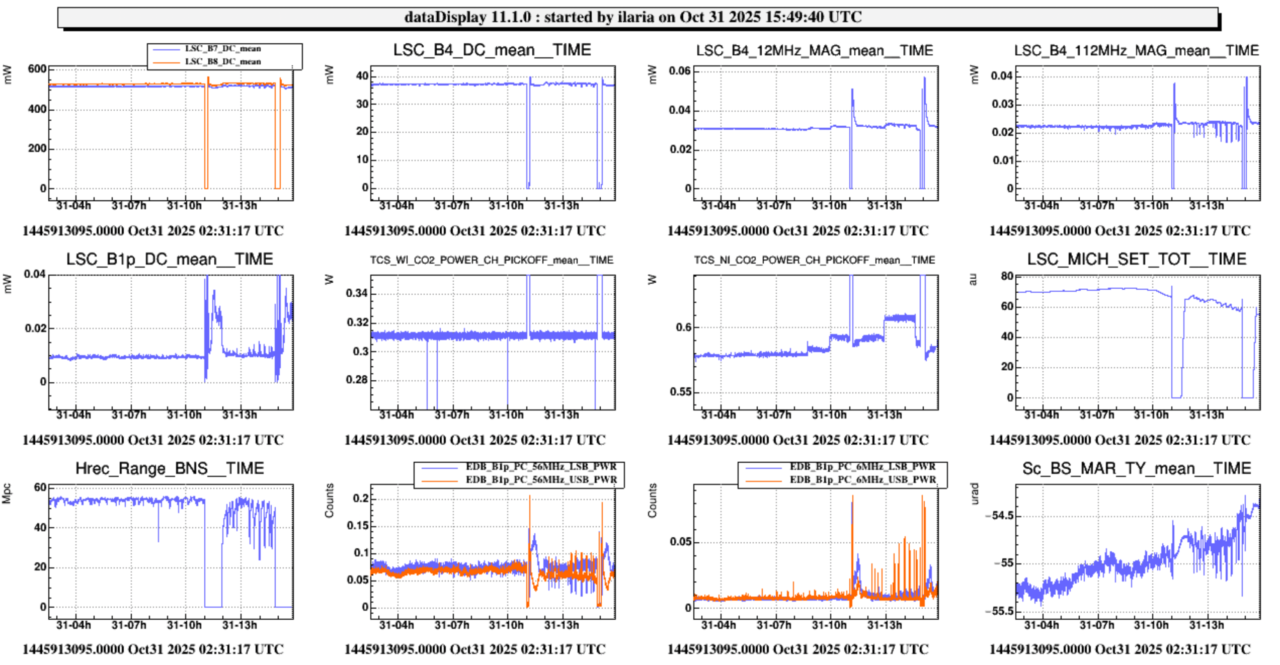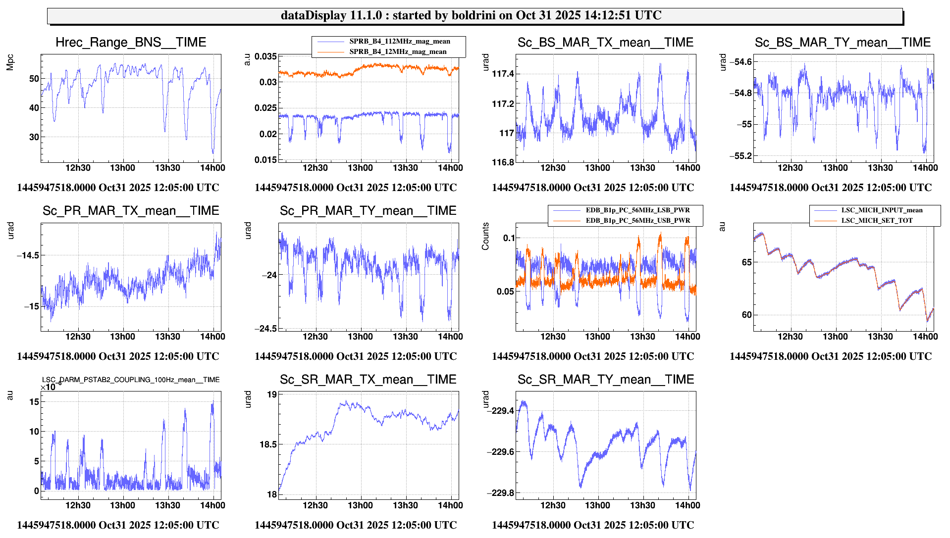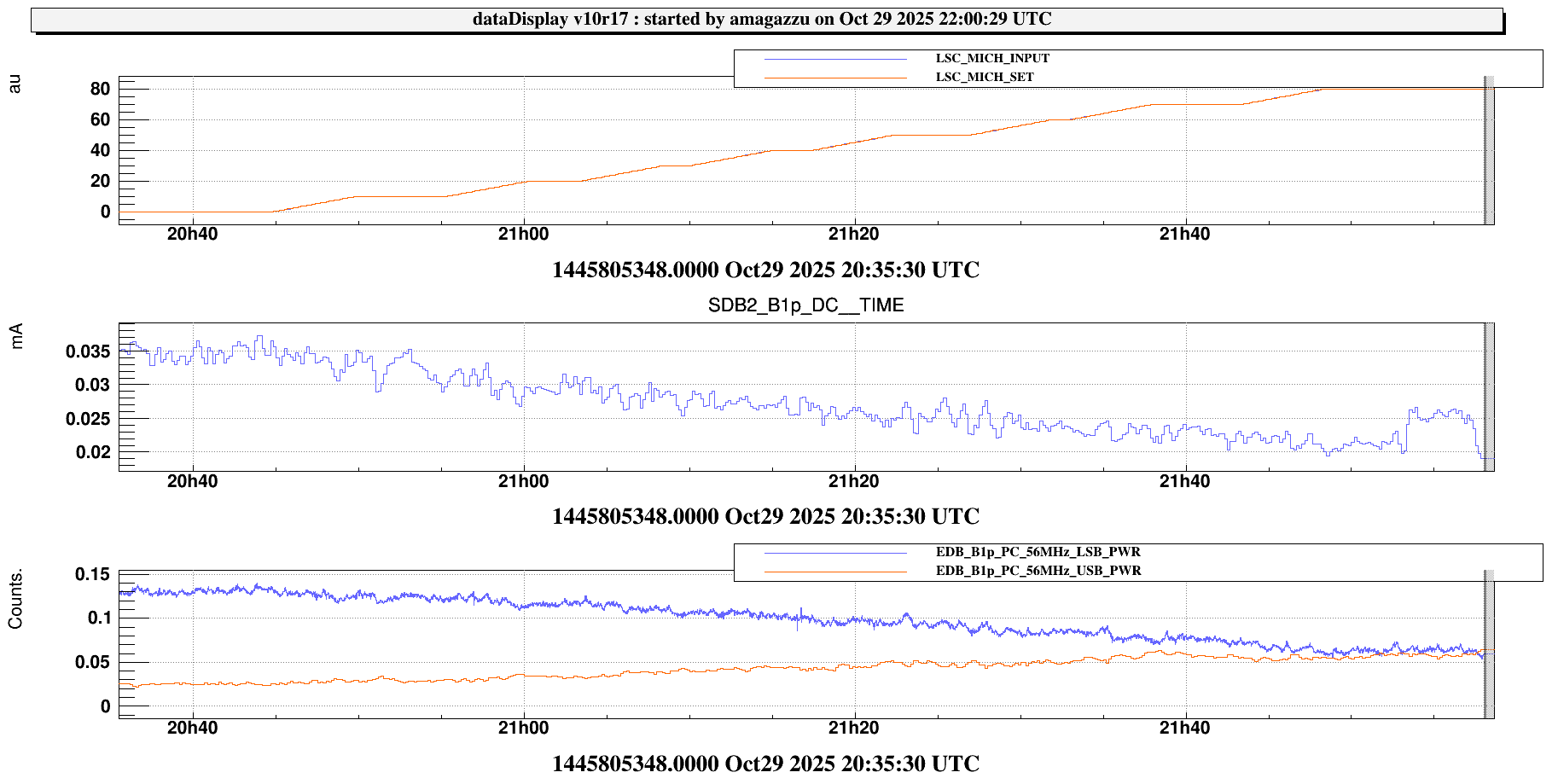 - If the sensitivity is bad after the thermal transient and the ITF unlocks, set again the PR CHROCC at 4.29V with ramptime 1500 sec and increase the MICH_SET value (after parking in CARM_NULL_1F for ~10 minutes) in steps (0->20 in 200s), (20->40 in 200s), (40->60 in 200s), (60->65 in 60s) until power on B1p decreases to ~0.02 mA and EDB_B1p 6, 56MHz upper & lower sidebands become superposed (or balanced) before progressing lock acquisition.