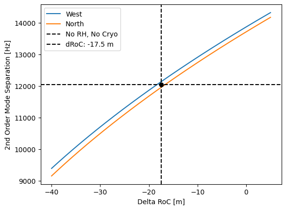 Ideally, we would have taken data with no cryotrap & no ring heater. Then we could compare that gouy phase number directly against the LMA measurement. We don't have that, so using the LMA measurements for the input mirror and the second order mode seperation frequency, I solved for the end mirror RoC. In the North arm, it is 1653 m with the no RH + cryostat and 1678 m with the RH + cryostat. In both cases it comes out to +25.0m.