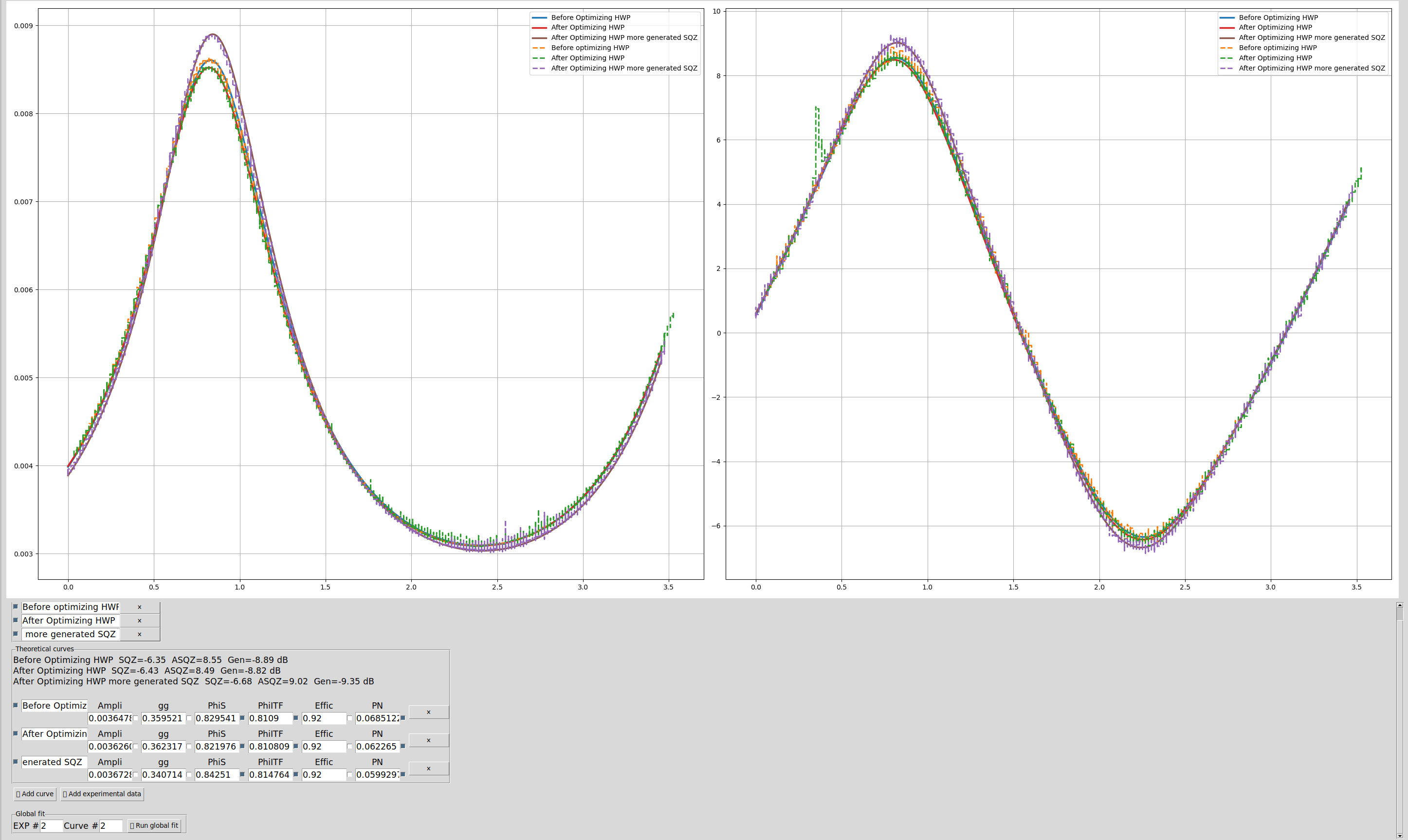 | 05/02 15:48:44 | 0.402 = 7.91 dB | 94.1(2) % | 110(1) mrad | 5.53 dB | 7.34 dB | Less generated squeezing/ no alignment | Fig 7 |