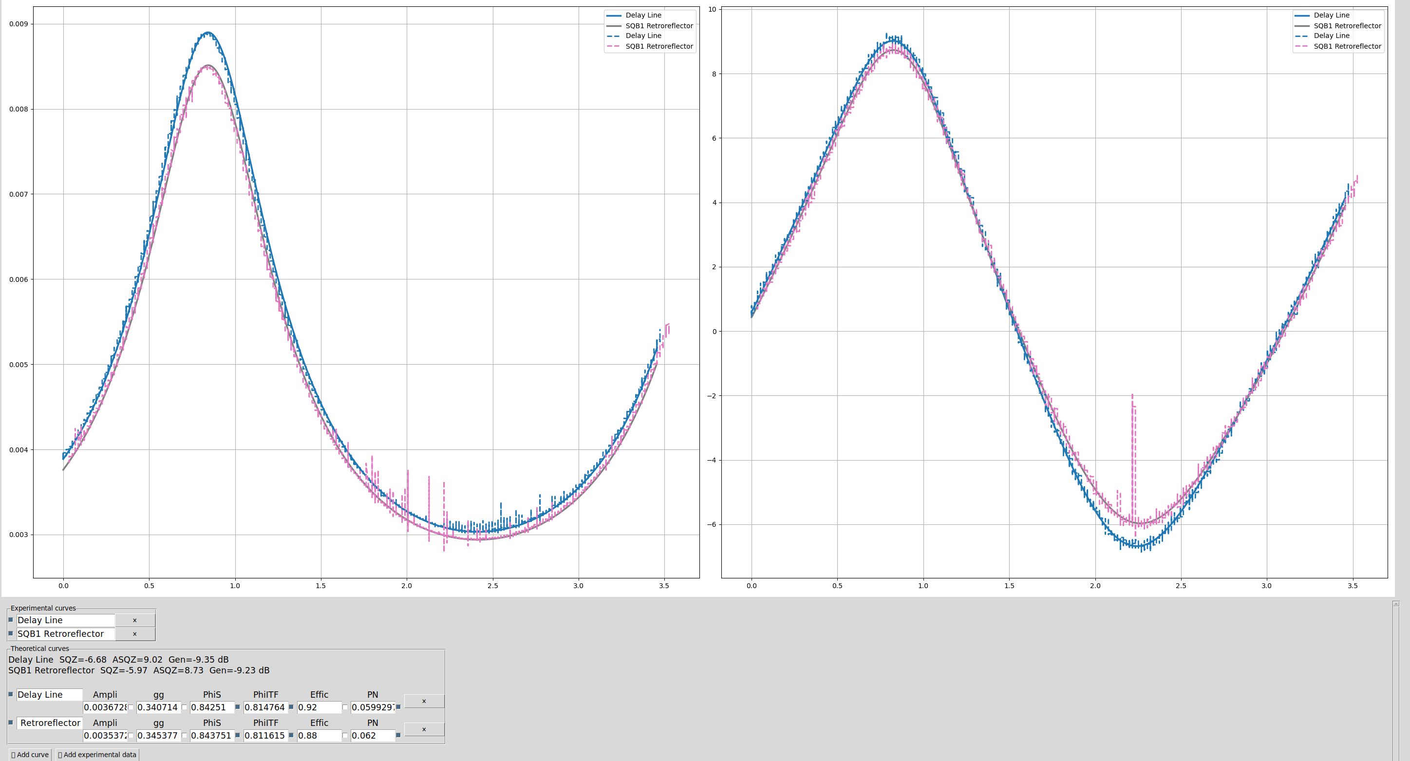 Fig 7 a phase scan with the retroreflector and comparison with delay line. In the same condition. The phase scan was run at 15:45:30 UTC of Tuesday 10 February. The amount of losses increased by 4% between DL and retroreflector and the phase noise remained similar