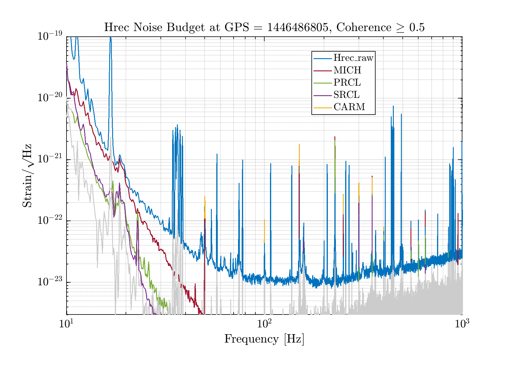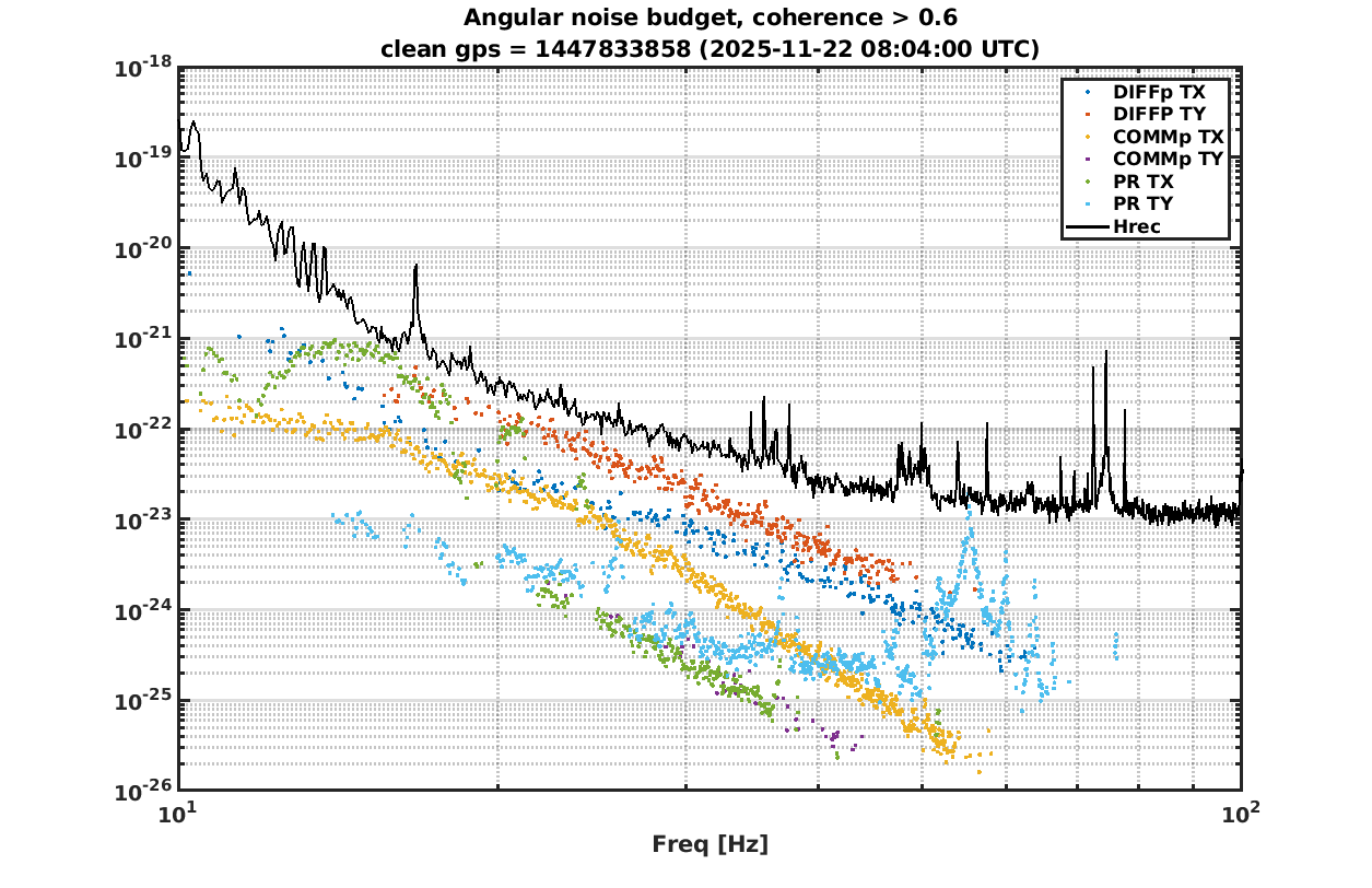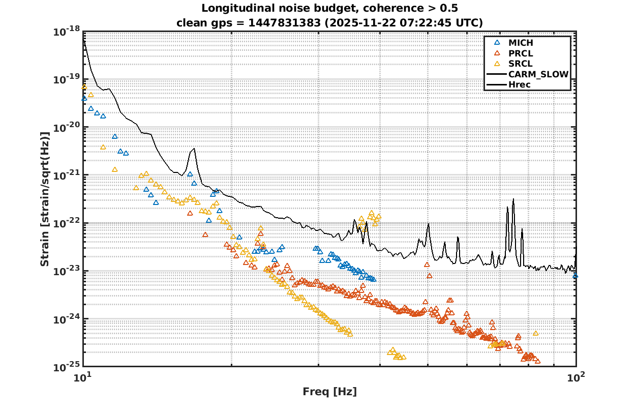 The noise budget is not particularly different than the recent ones: CARM is the most impacting contribution to DARM, while it's not the case in Hrec, as the reconstruction takes care of it by looking directly at the single mirror corrections. On Hrec, MICH is the most limiting one despite the two subtractions we have.