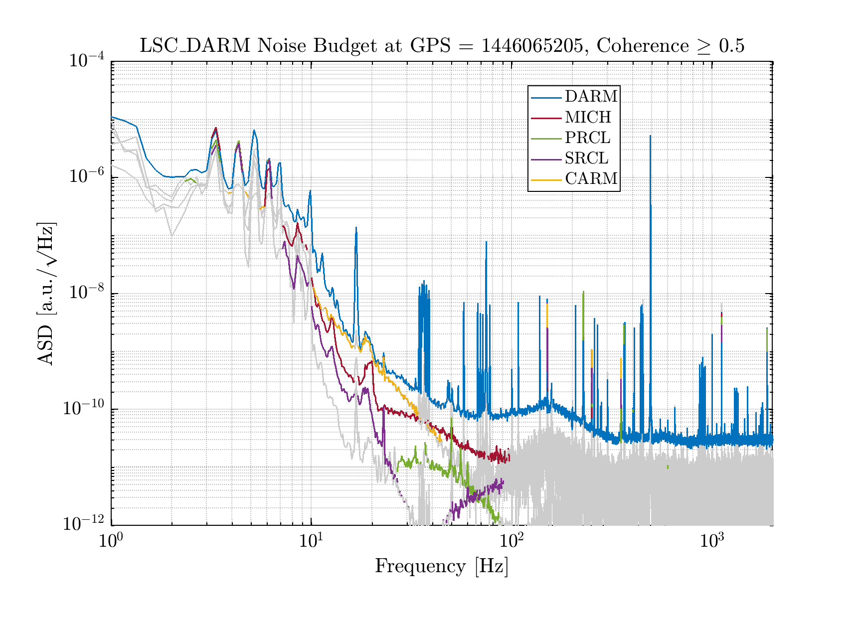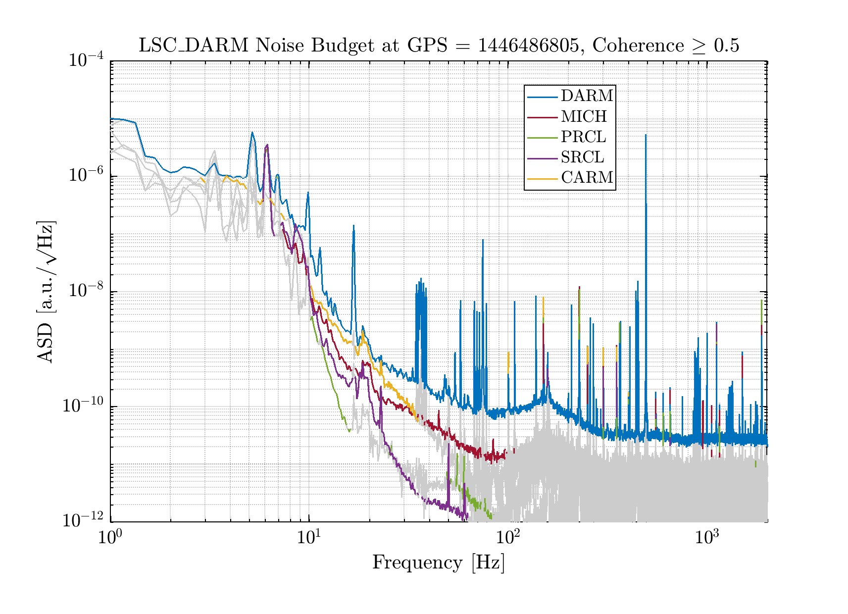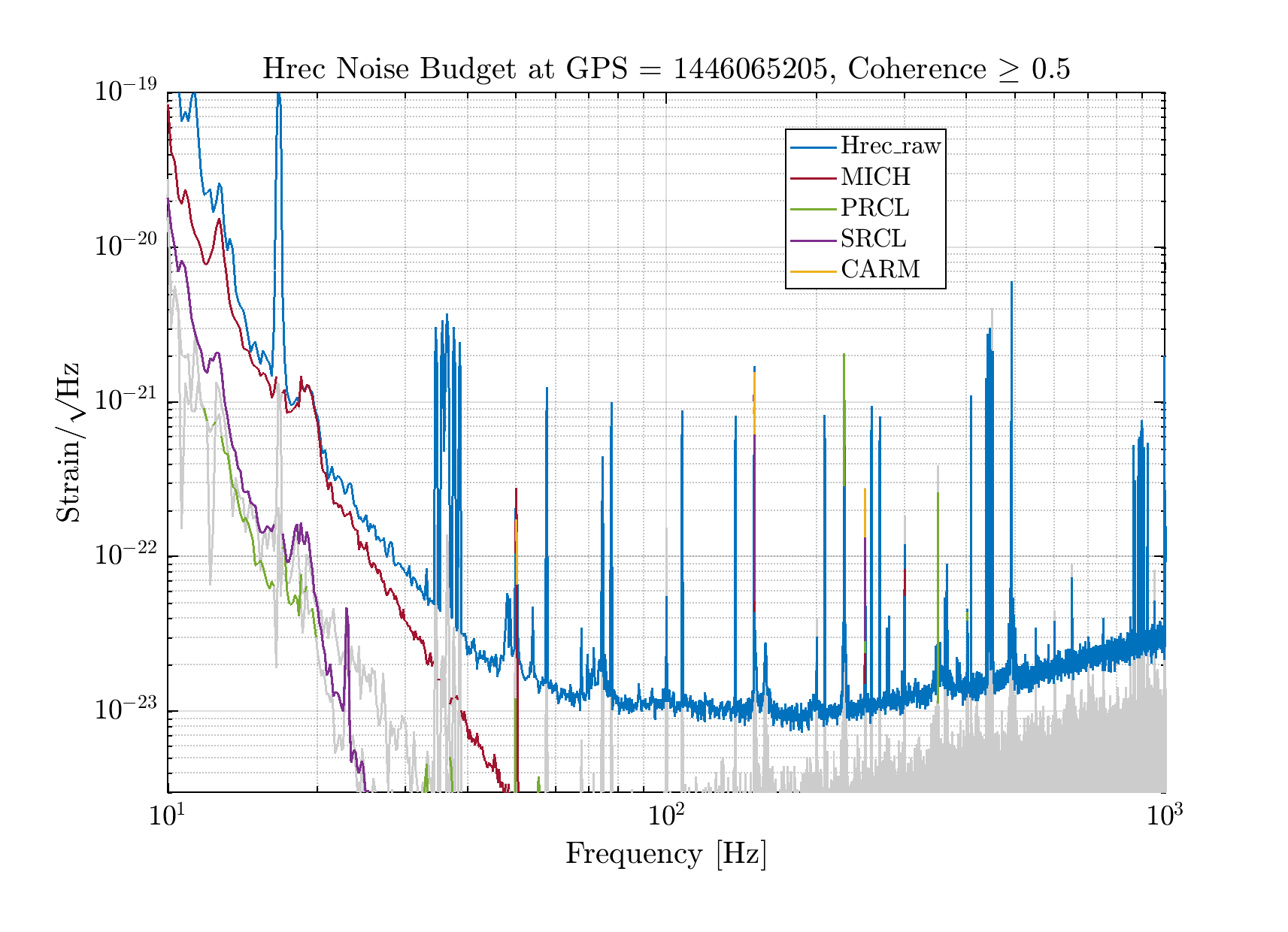 The noise budget is not particularly different than the recent ones: CARM is the most impacting contribution to DARM, while it's not the case in Hrec, as the reconstruction takes care of it by looking directly at the single mirror corrections. On Hrec, MICH is the most limiting one despite the two subtractions we have.