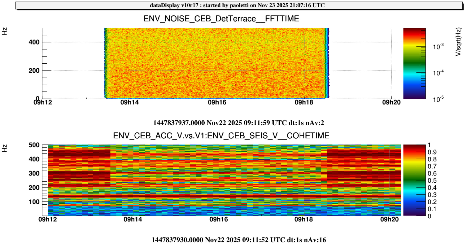 Note that the Coeherence between the two nearby sensors (ENV_CEB_SEIS_V and ENV_CEB_ACC_V) is reduced during the acoustic injection in CEB