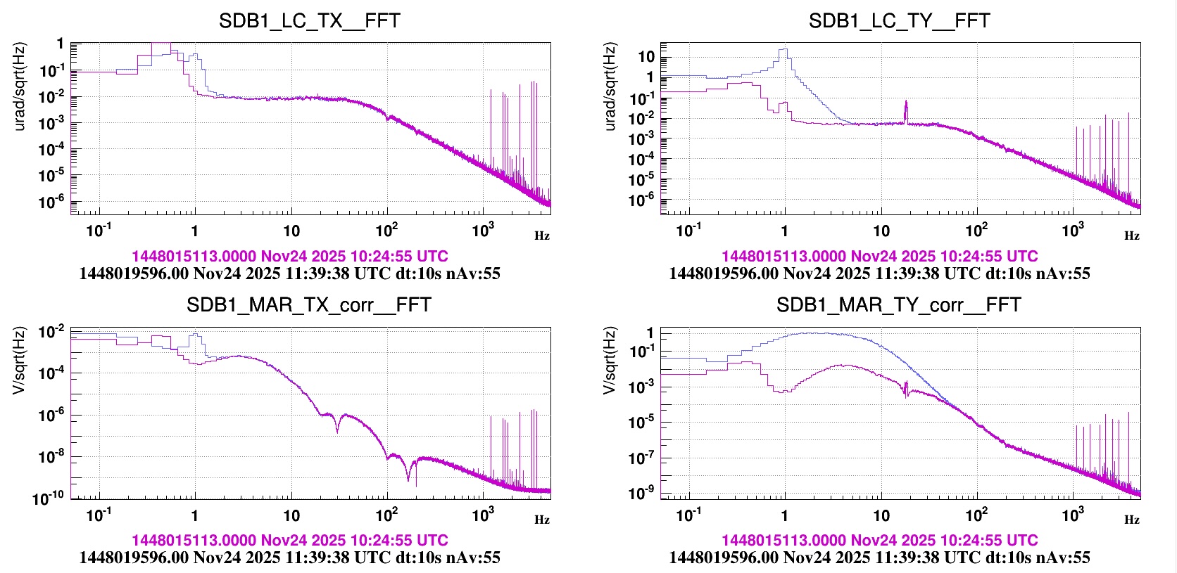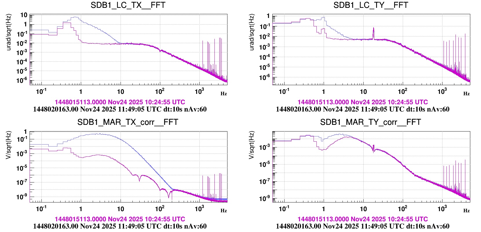 We generated white noise using NOISE_flt with an amplitude of 1 V/√Hz, applied a 1–10 Hz band-pass filter, and injected the signal in the TY direction. However, we were unable to observe any clear response in SDB1_LC_TY above 5 Hz, including when attempting injections at slightly higher frequencies (see Figure 1 - TY.jpg). This injection ran from 11:35:03 UTC to 11:40:09 UTC.