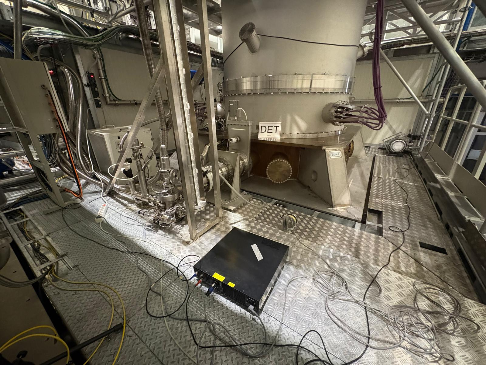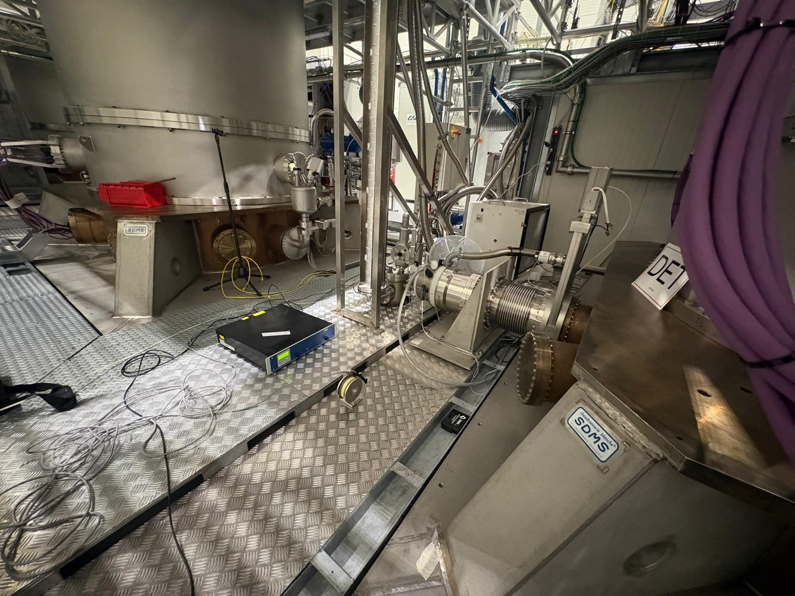 Near the DET turbo pump, the amplifier was left powered and the small coil connected to it (the shaker will be installed later), see Figures 1 and 2. For the injections, the DAC dedicated to acoustic injections in the Central Building will be used (DAQ BOX 30, SM 21, ch 7). The corresponding cable was left on the floor, near the rack (Figure 3).