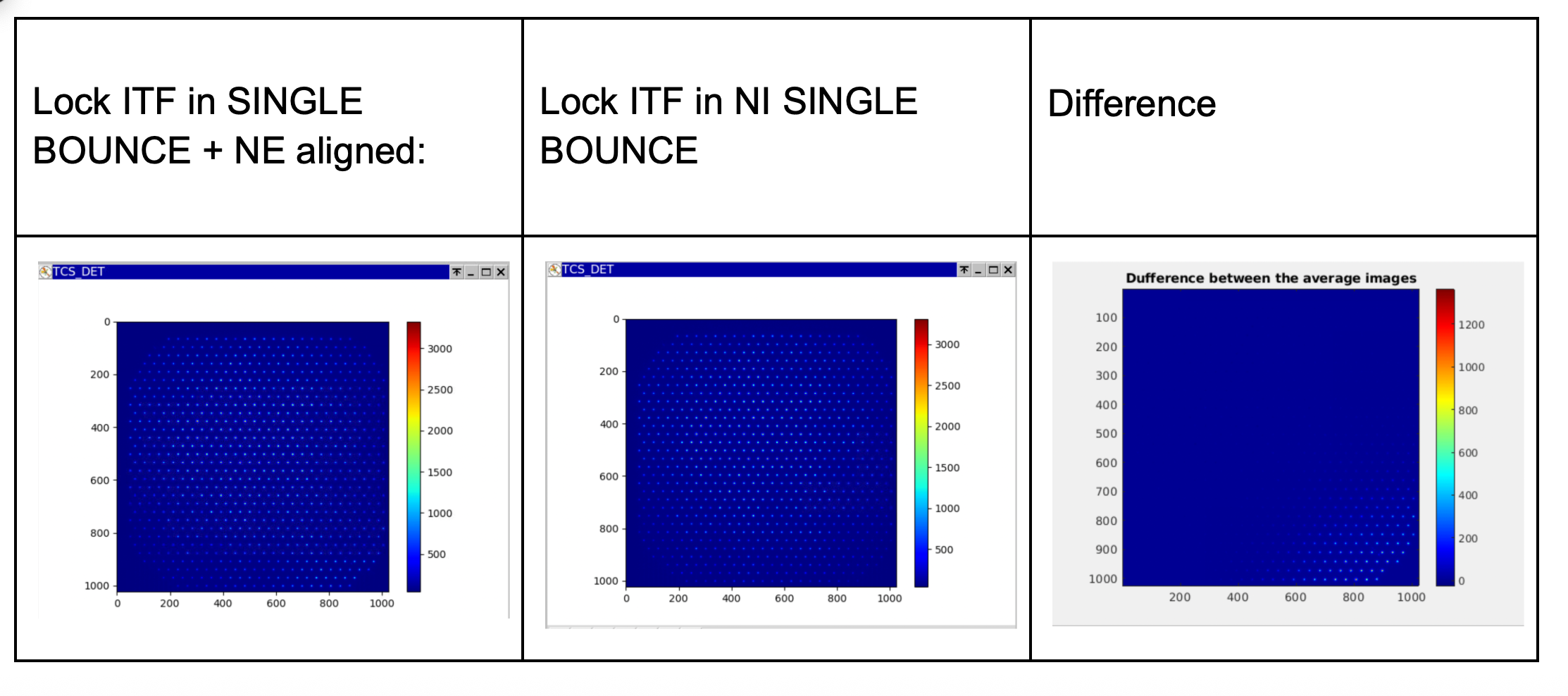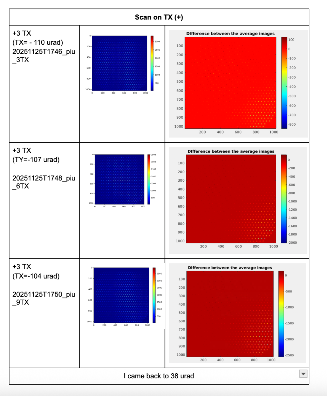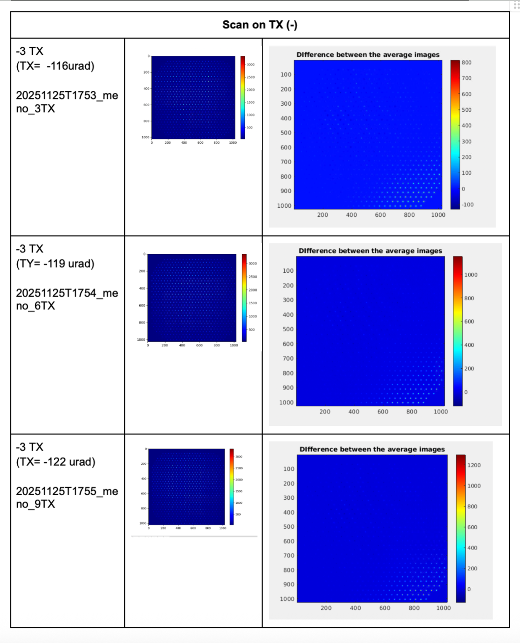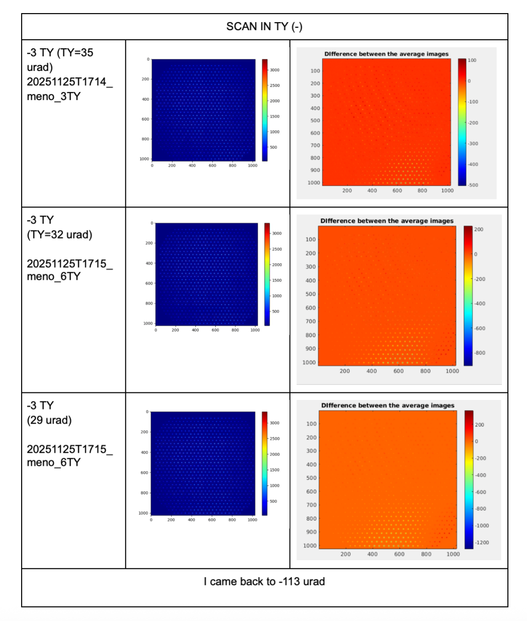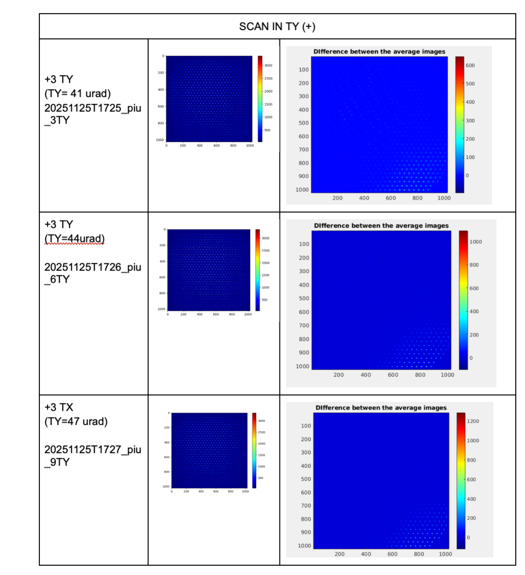 The CCD illumination patterns acquired at each step, as well as their differences with respect to the aligned configuration, are shown in Figure 2- 3 for the TY scan and in Figure 3-4 for the TX scan.