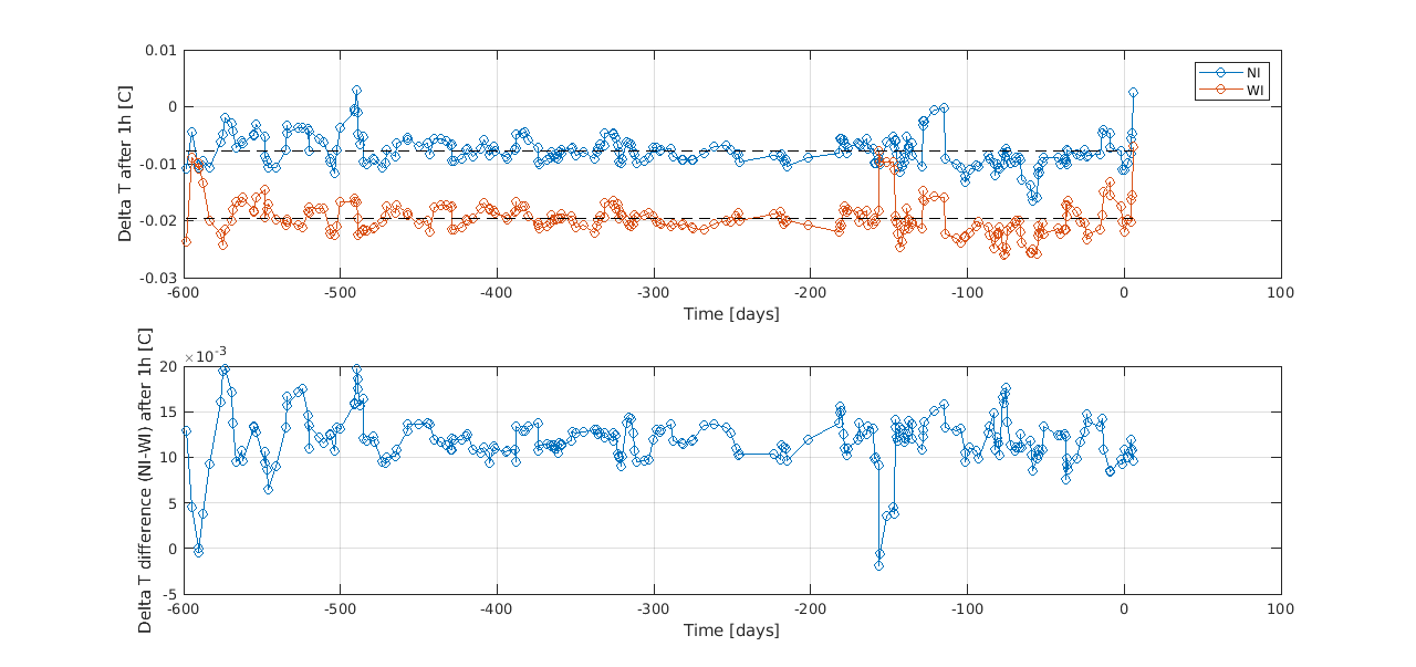 Moreover if I compute the difference between the delta temperature, to remove common temperature variation due to external disturbances, it is visible from the bottom plot that the WI temperature decrease of ~0.01 [C] more than the NI after 1h of missing YAG.
