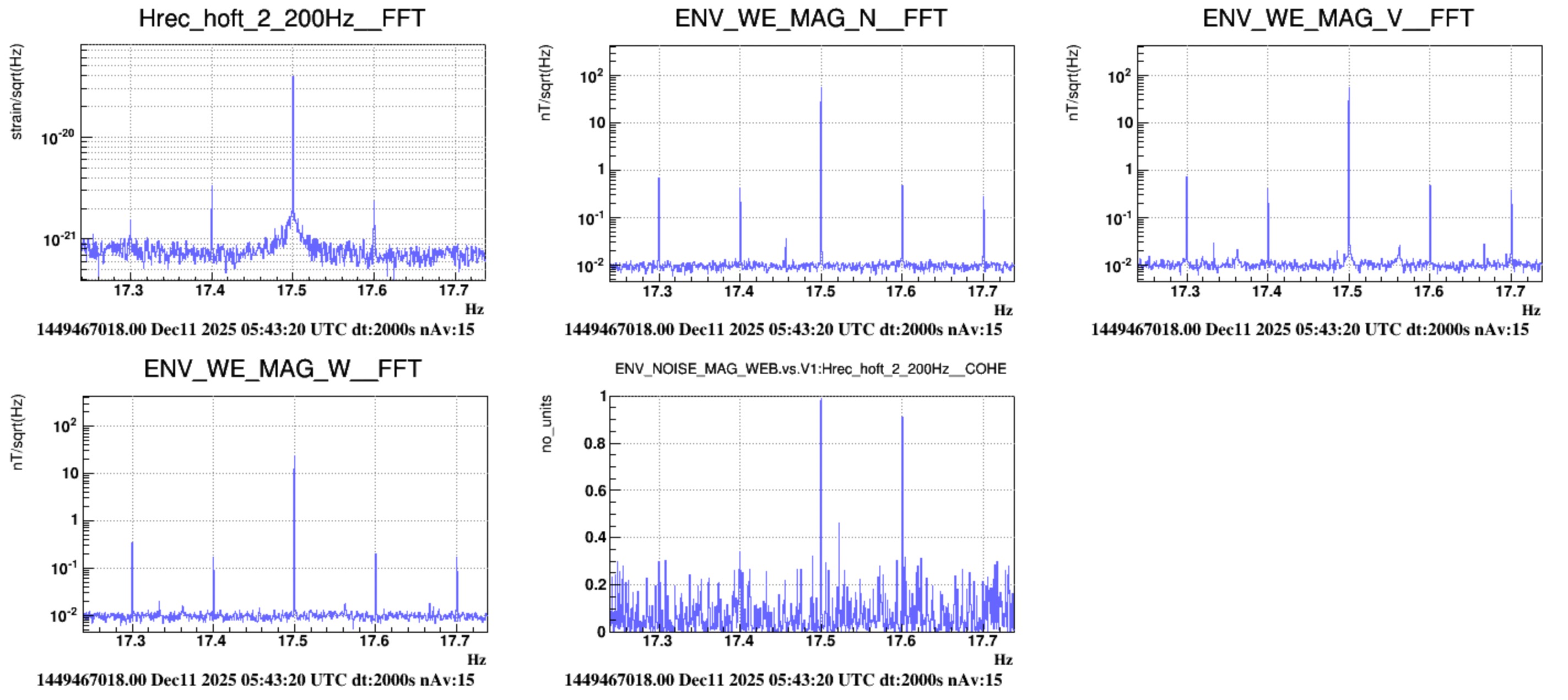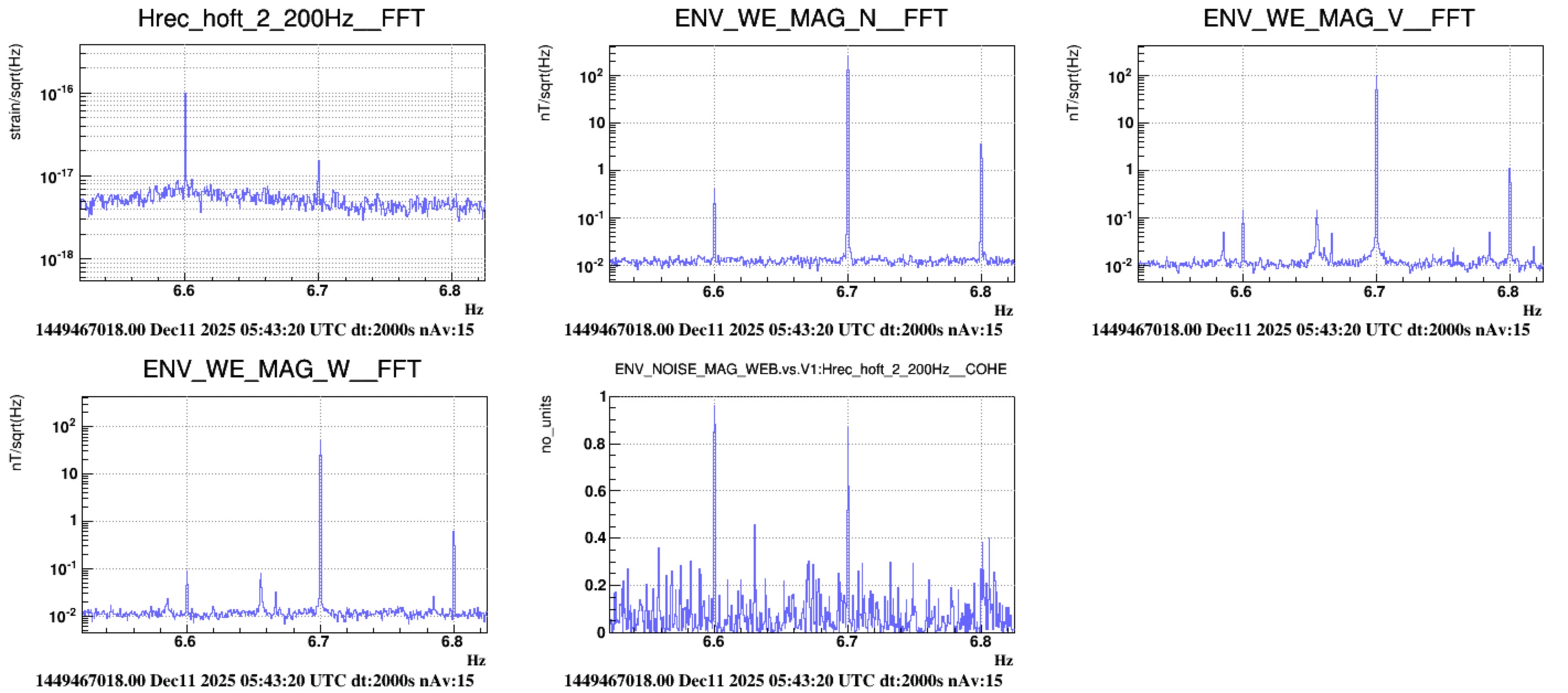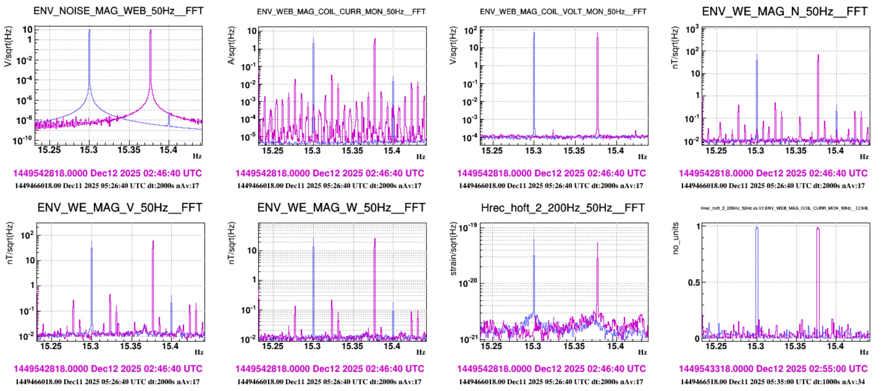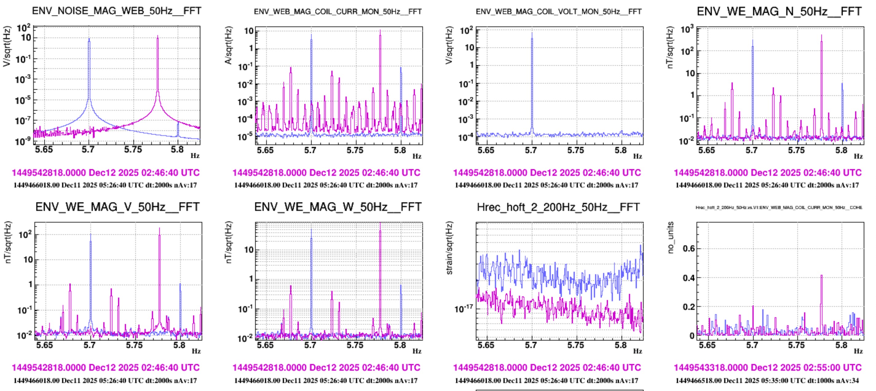 Yet, the choice of setting lines's frequency at multiples of 0.1 was not good, because of the presence (forgotten) of an underline 0.1Hz spaced comb which is largely coherent between hrec and magnetometers. Therefore, we would possibly repeat the injection with a better choice of frequencies.