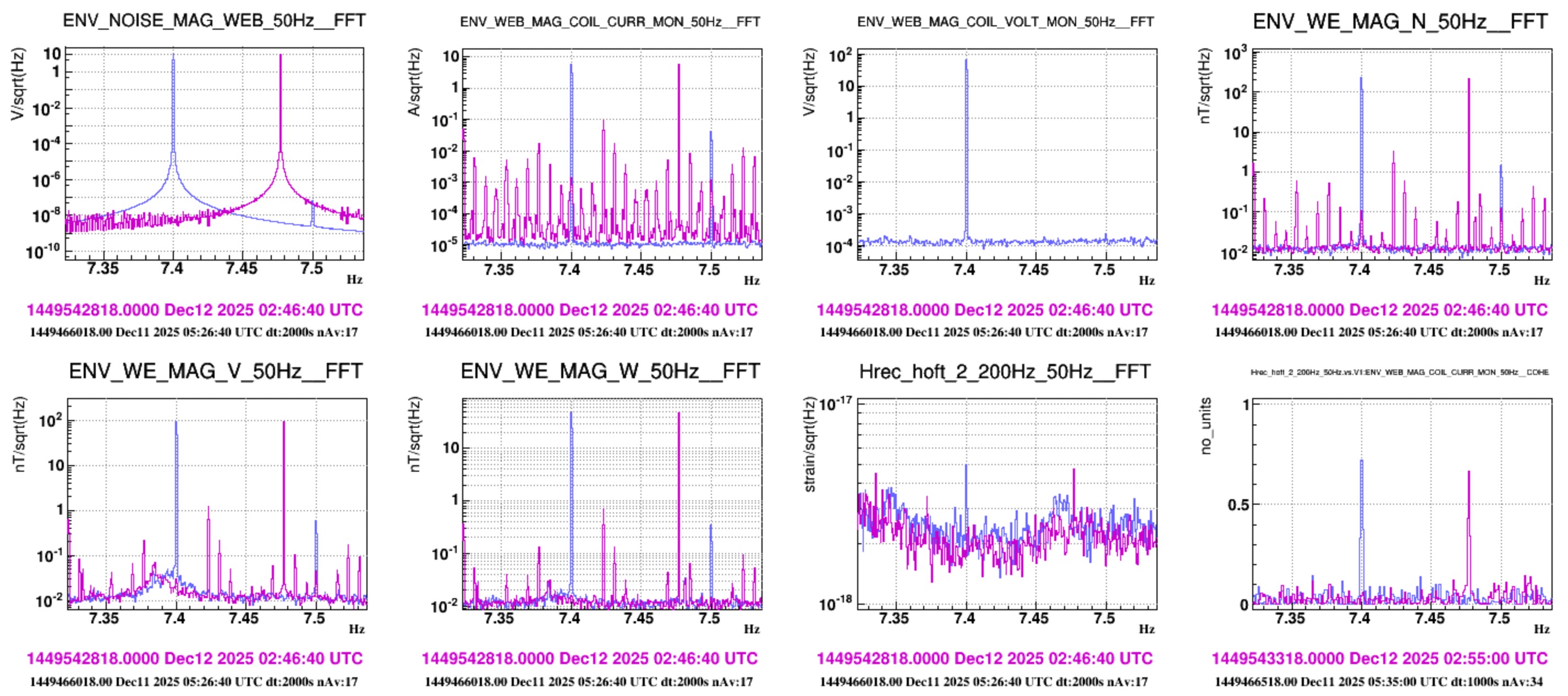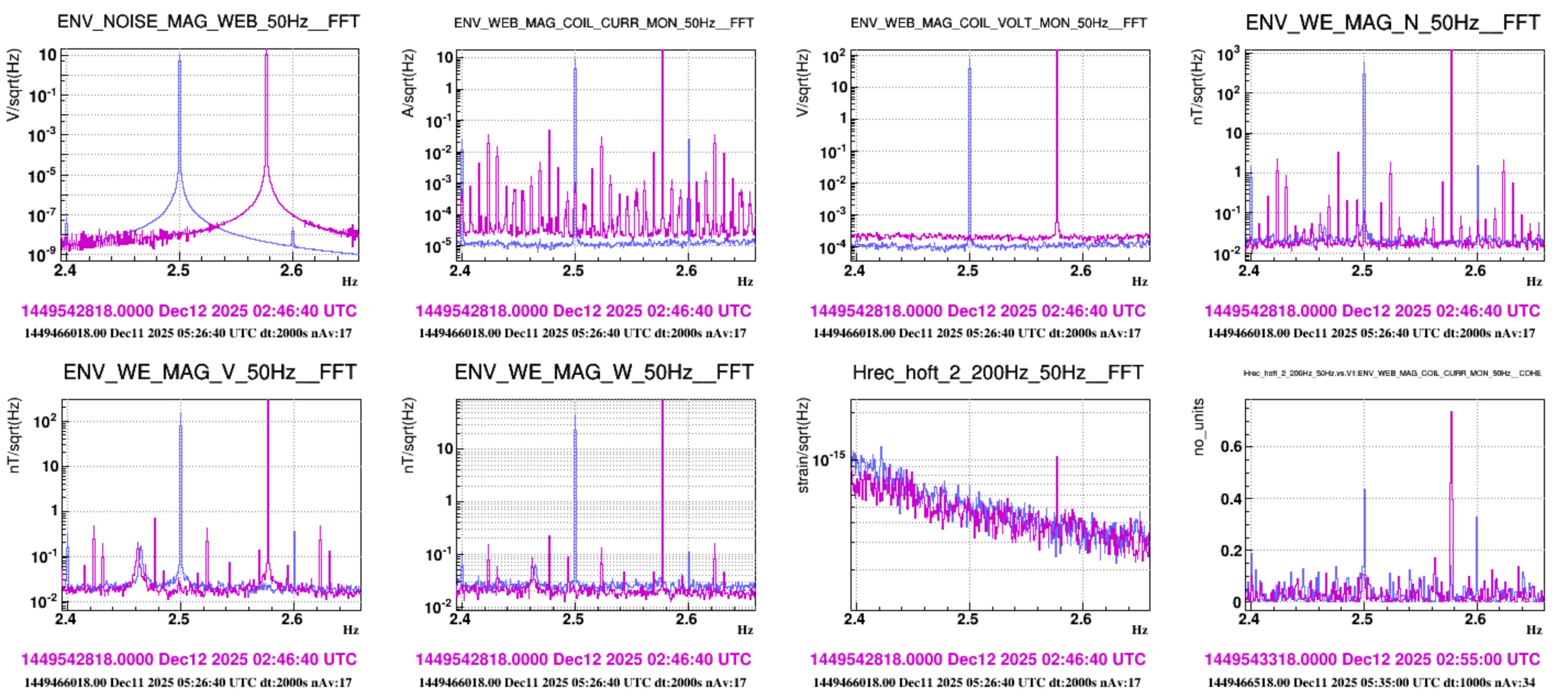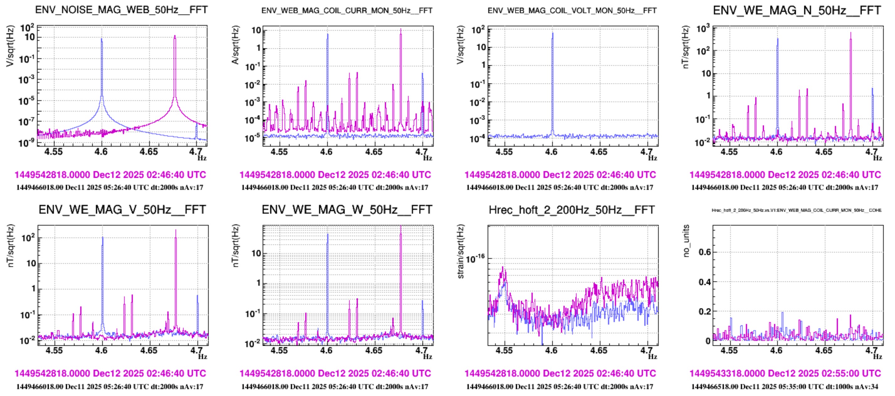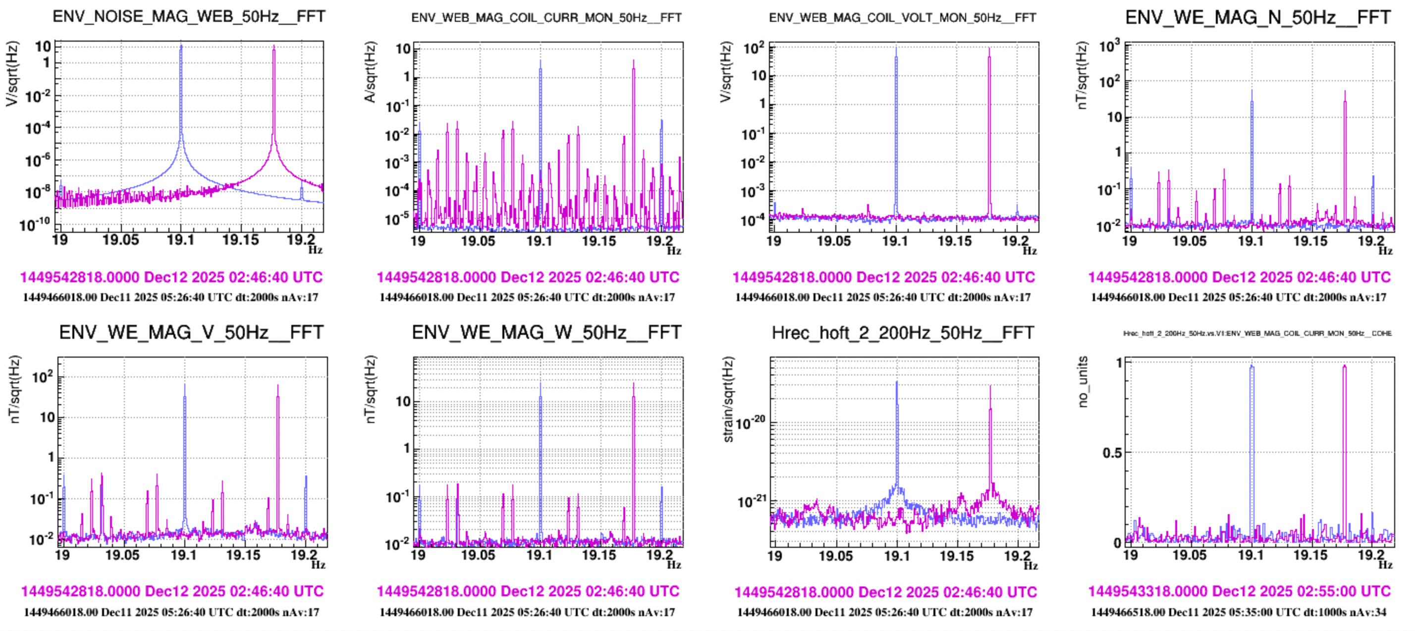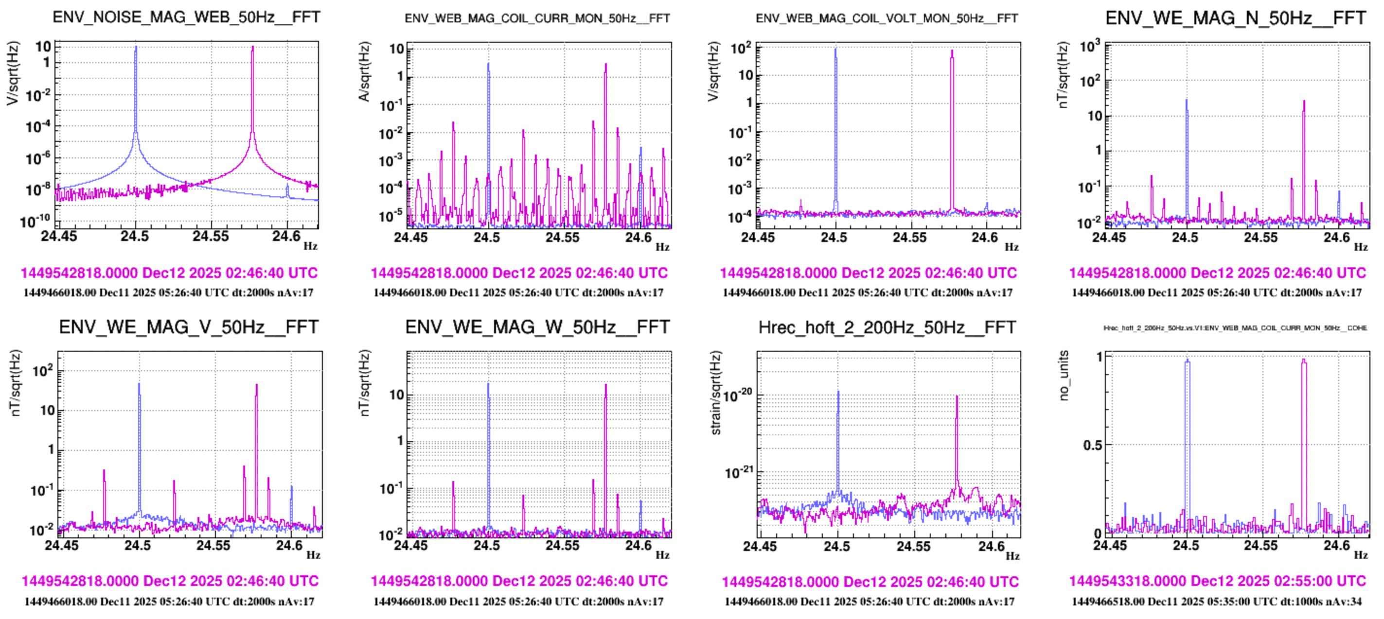 Yet, the choice of setting lines's frequency at multiples of 0.1 was not good, because of the presence (forgotten) of an underline 0.1Hz spaced comb which is largely coherent between hrec and magnetometers. Therefore, we would possibly repeat the injection with a better choice of frequencies.