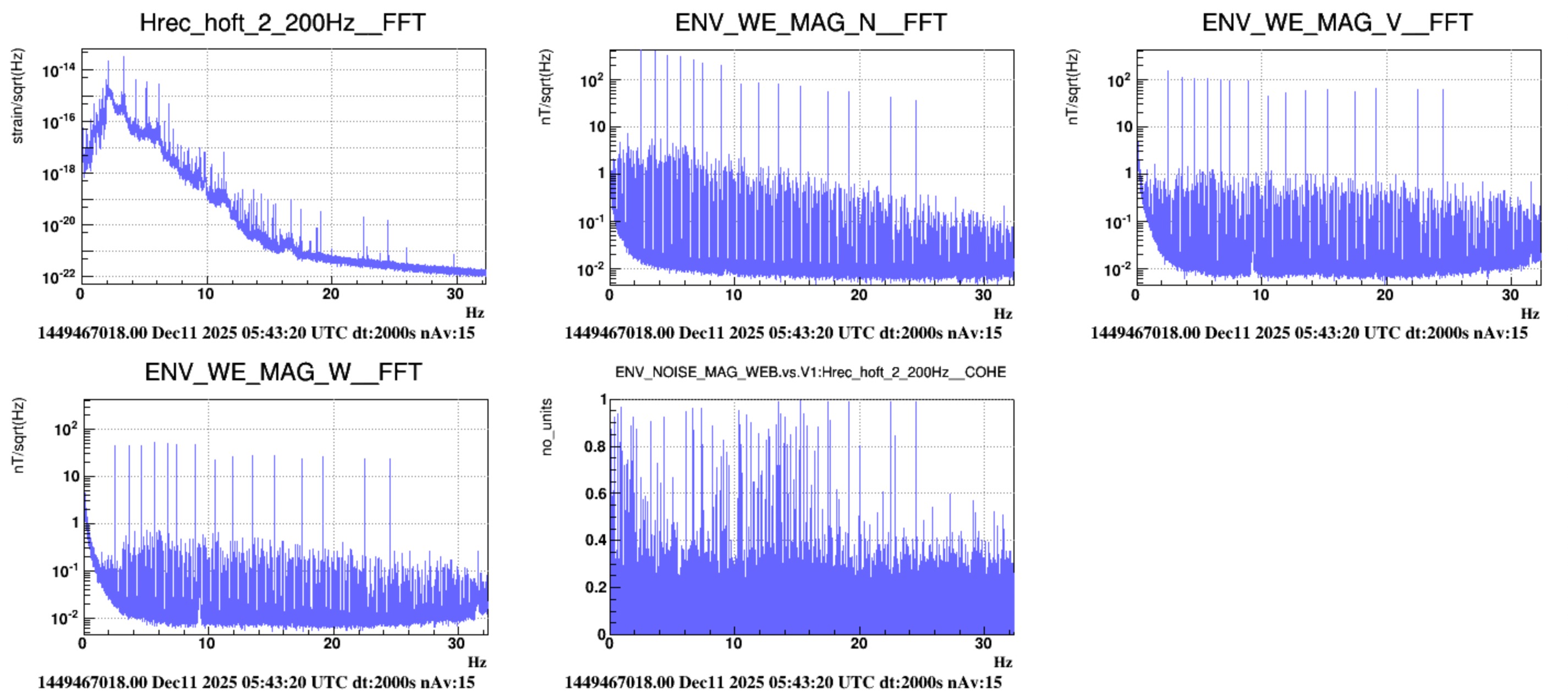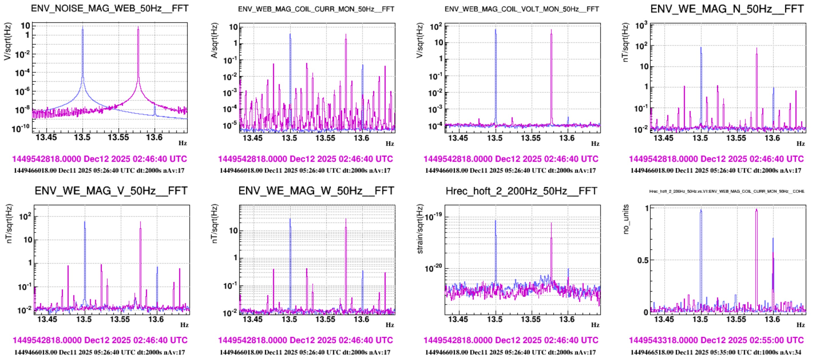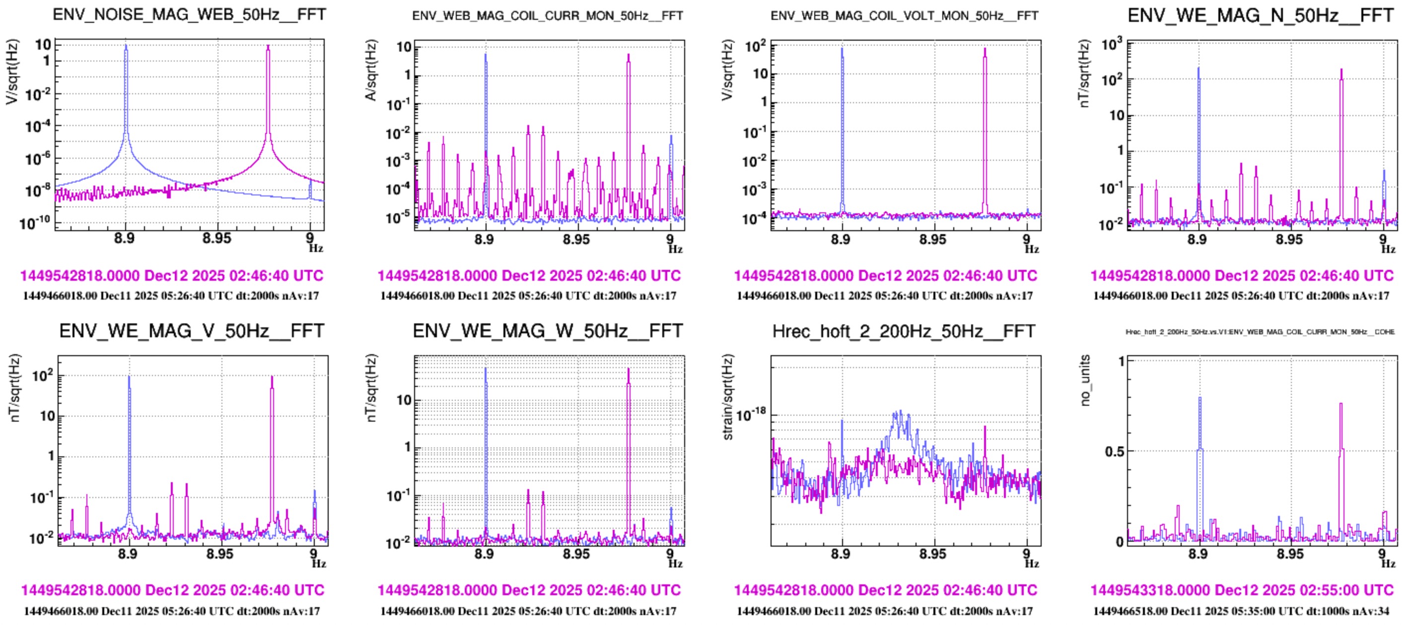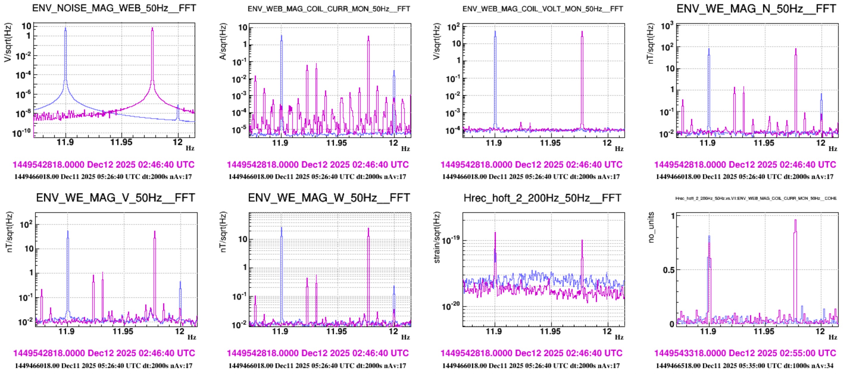 Yet, the choice of setting lines's frequency at multiples of 0.1 was not good, because of the presence (forgotten) of an underline 0.1Hz spaced comb which is largely coherent between hrec and magnetometers. Therefore, we would possibly repeat the injection with a better choice of frequencies.