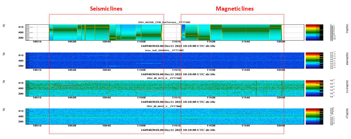 We injected magnetic and seismic lines at 390, 395, 401, 405, and 410 Hz.