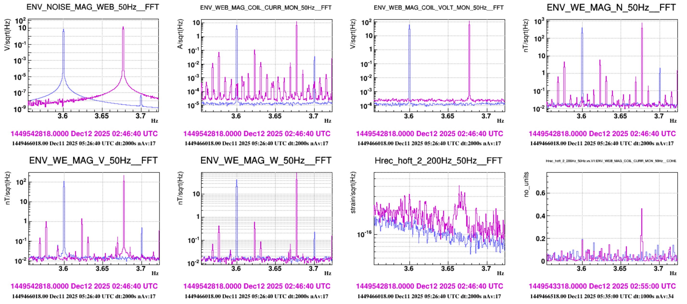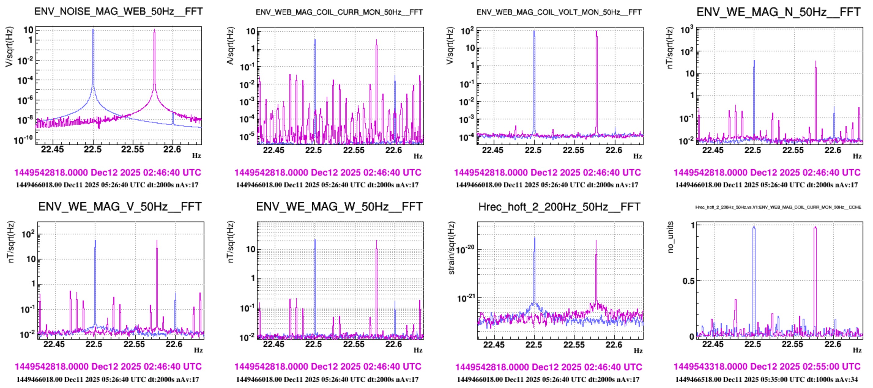 Therefore, in the second set of injections we moved the lins frequencies at **.*77 Hz. This time we noticed a somehow larger spectral noise "floor" in the Voltage, Current monitors and magnetometers as well, which resembles a comb spaced by 0.77 Hz. However, this turns out to be better, because no such comb is present in Hrec a priori.