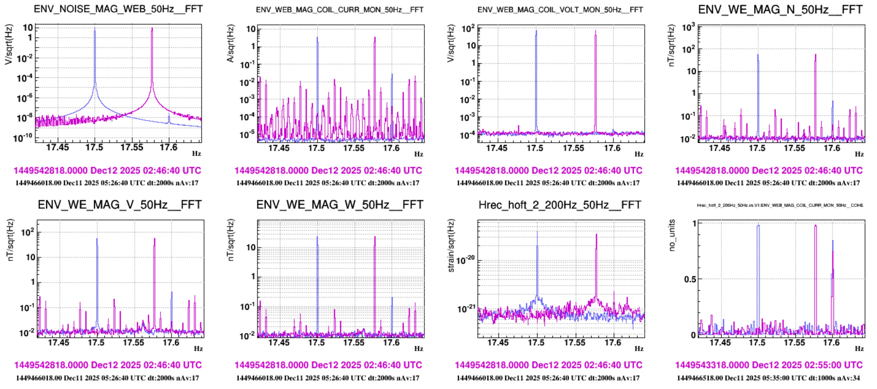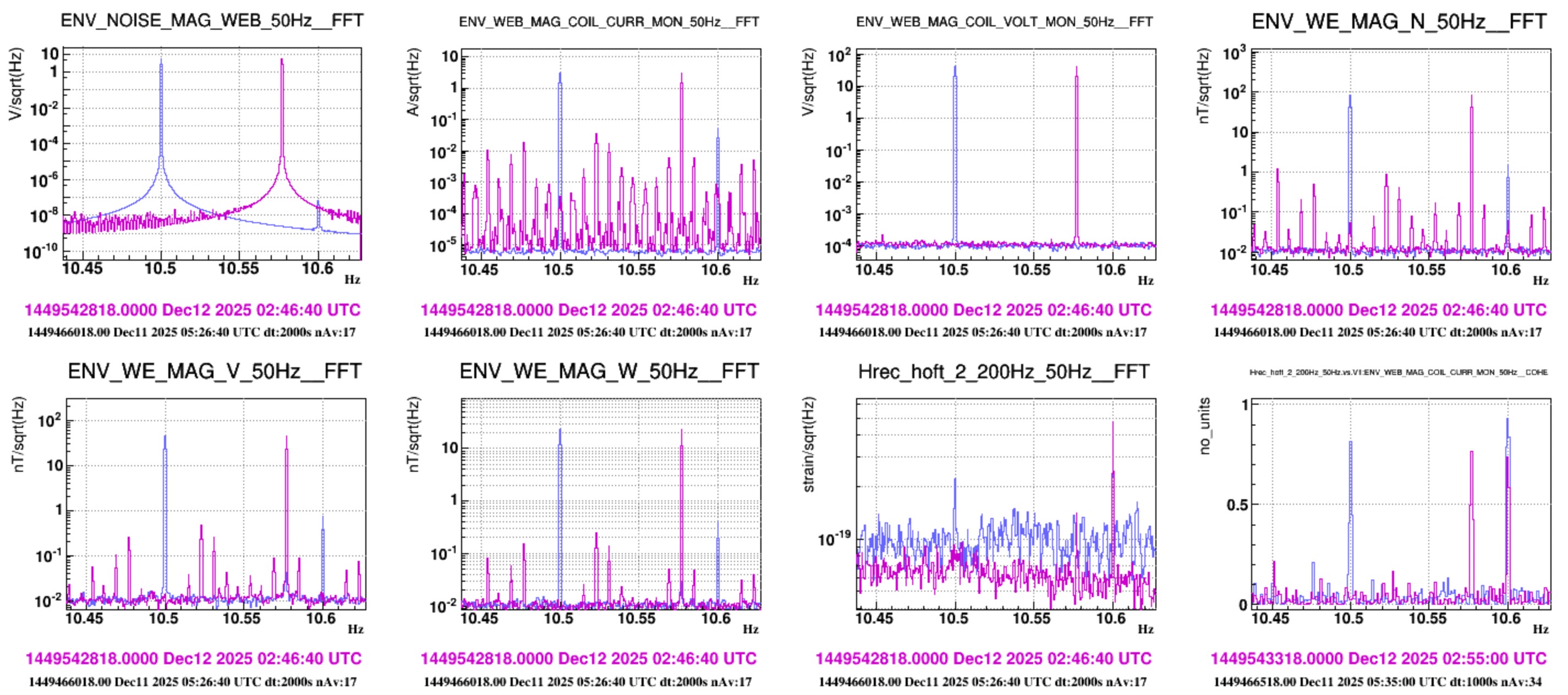 The first dataset is polluted by a 0.1 Hz spaced comb, which is present in the Voltage and current monitors of the large coil amplifier as well as in the witness magnetometer (placed close to the WE tower). We suspect this might be related to the injected lines being multiples of 0.1 Hz. The problem with this is that Hrec itself is polluted by a 0.1 Hz comb, although it is not related with our injected noise. Infact, as shown in Figure 16 (example around the injected line 10.5Hz) the same 0.1 Hz comb was present also when not injecting (purple).