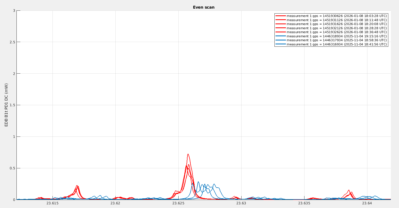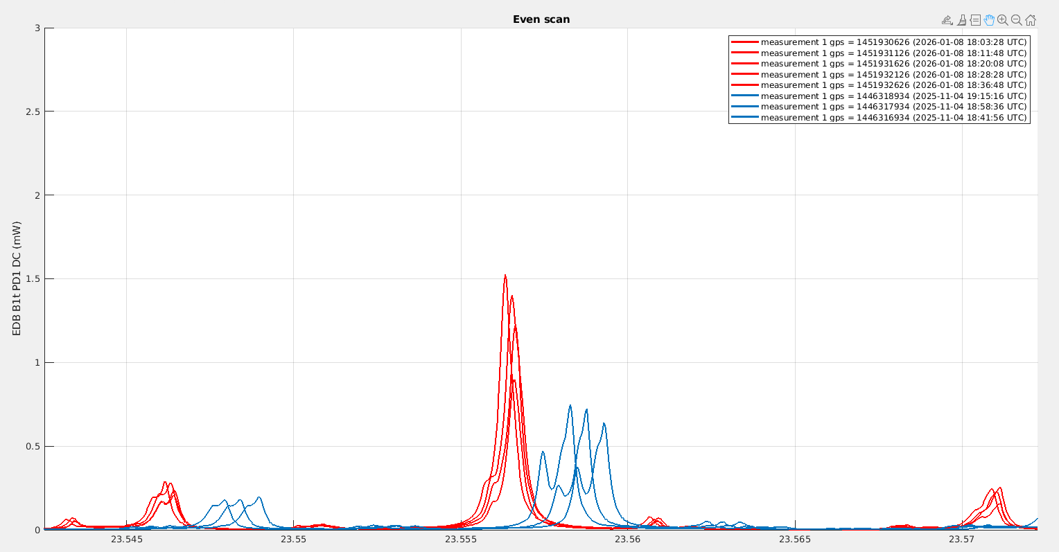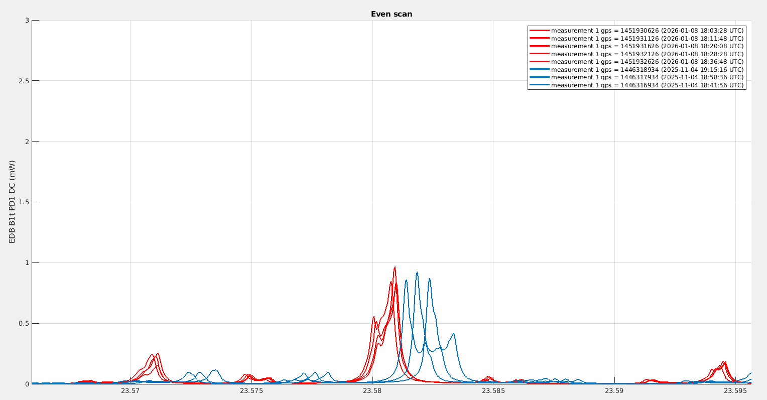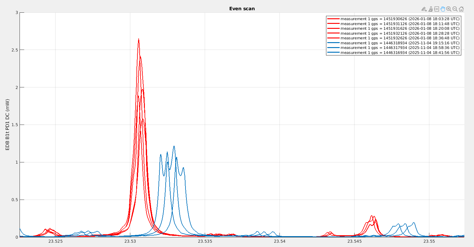 Looking at B1p, the power in November was fluctuating between 340mW and 400mW, while yesterday it was fluctuating between 230mW and 280mW. It is very confusing that the change we observe on B1p is in the opposite direction to the change in power we observe on B1s.