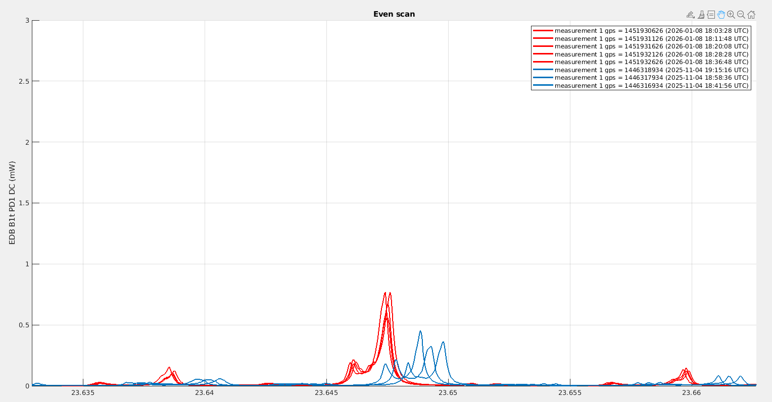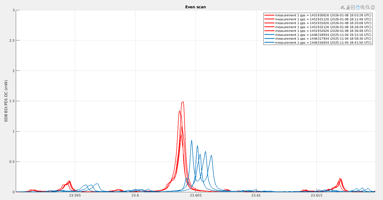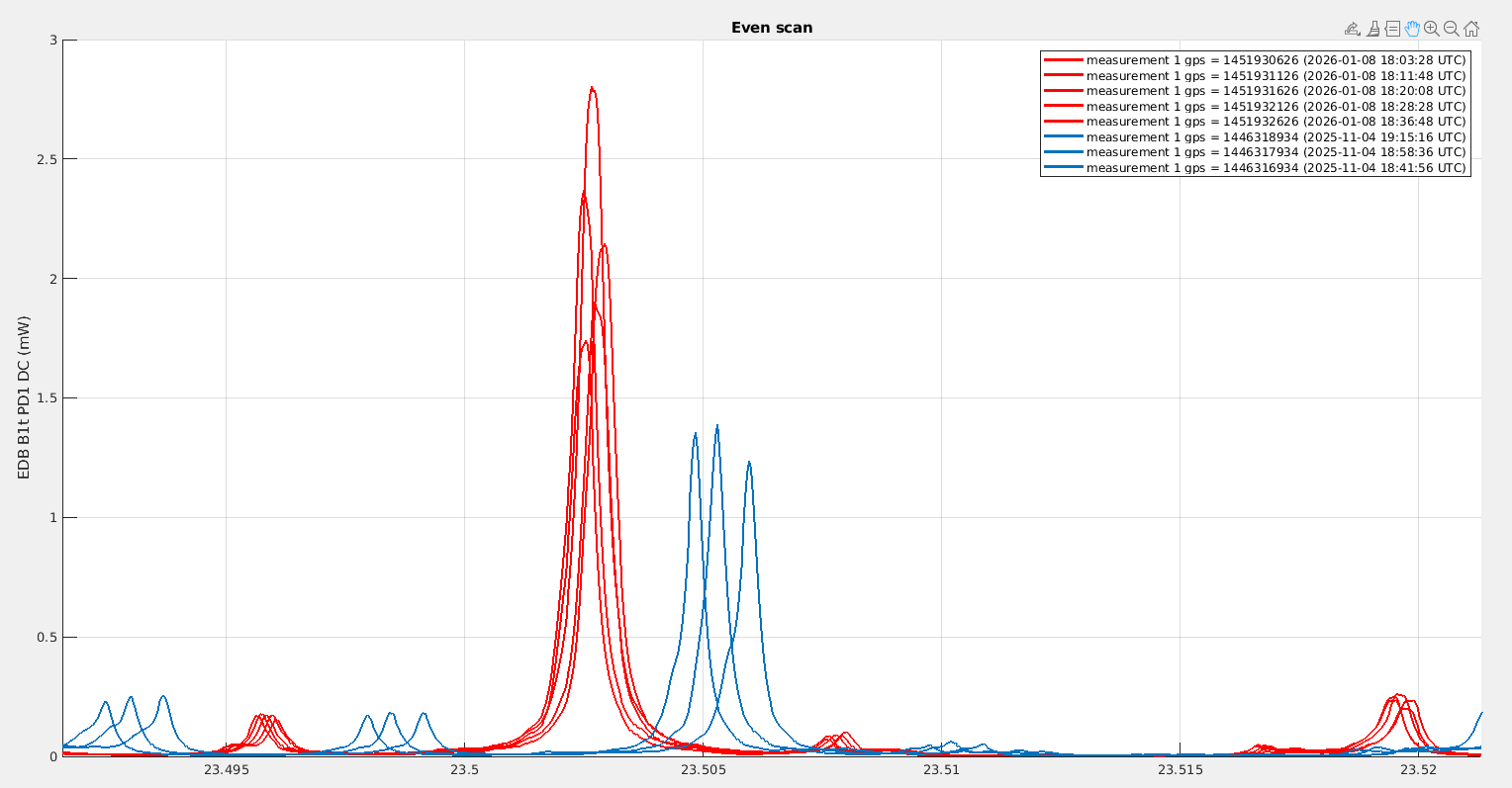 Looking at B1p, the power in November was fluctuating between 340mW and 400mW, while yesterday it was fluctuating between 230mW and 280mW. It is very confusing that the change we observe on B1p is in the opposite direction to the change in power we observe on B1s.