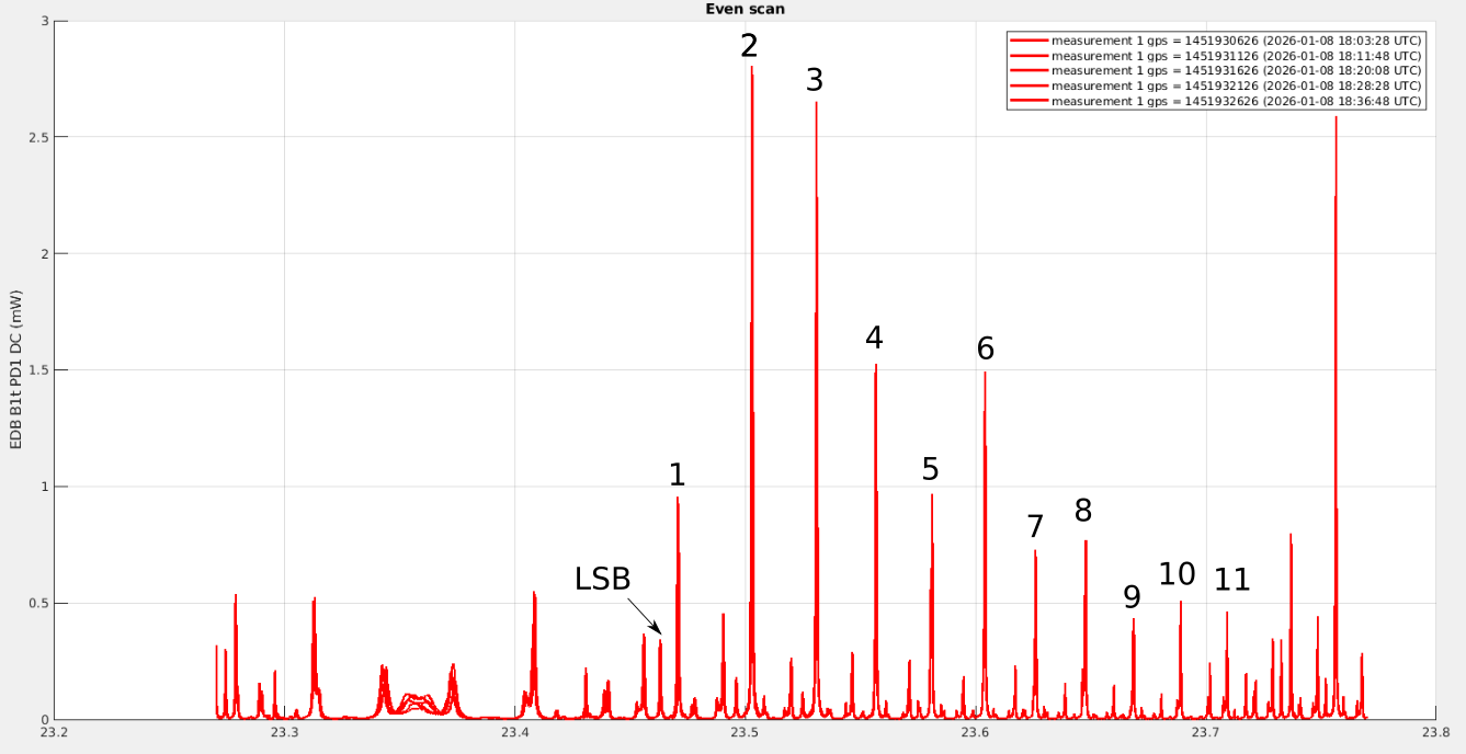 18:40 UTC (20min) EDB OMC scan with the speed reduced by a factor 4 to more easily see on the camera which mode is which peak