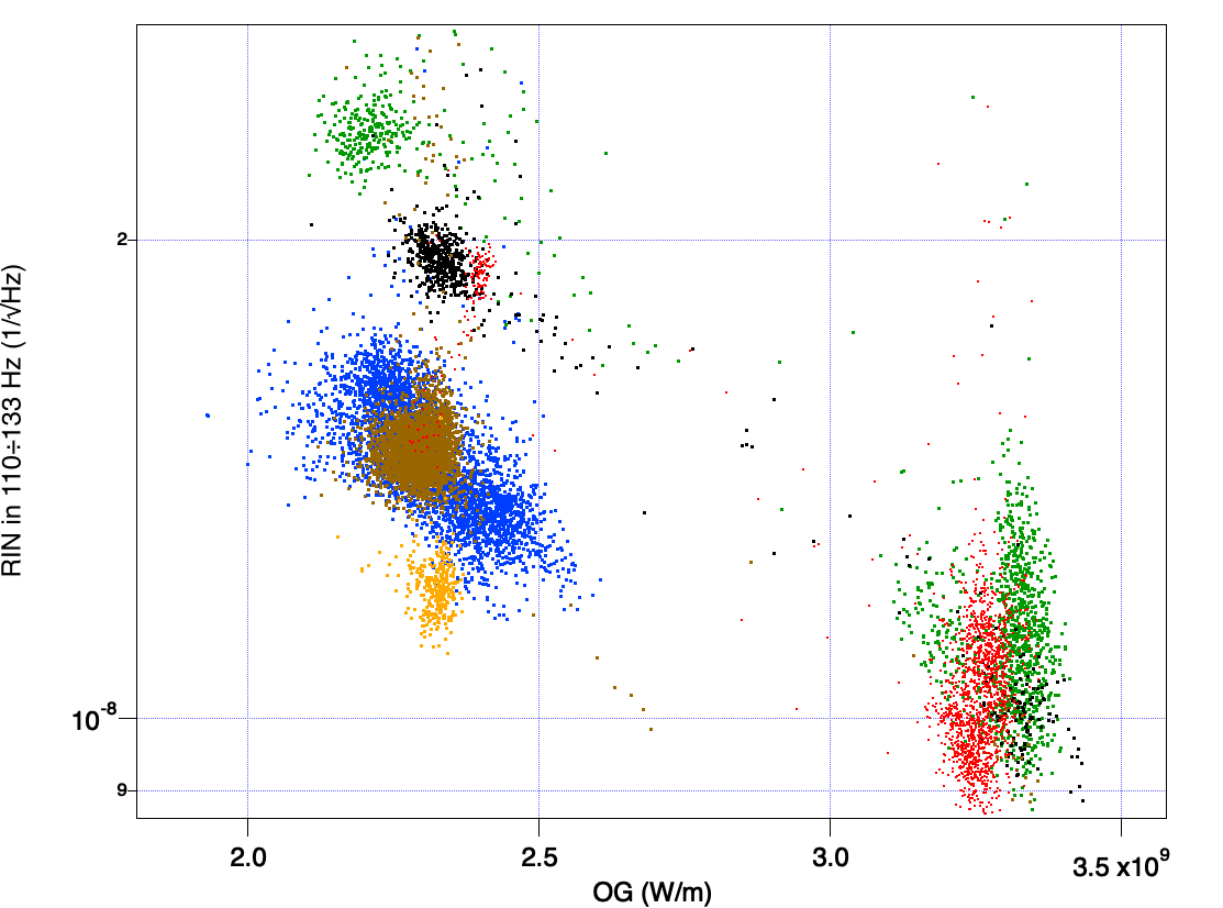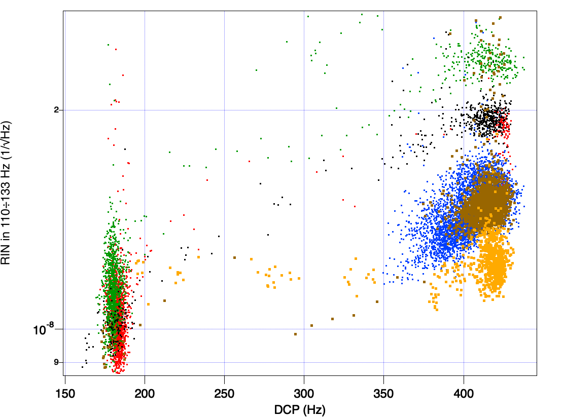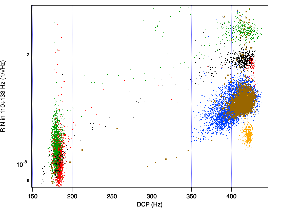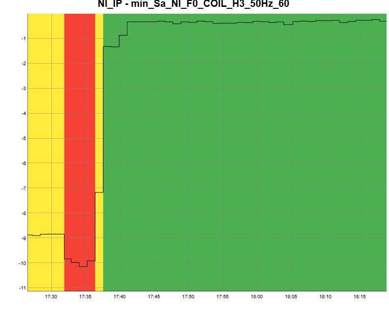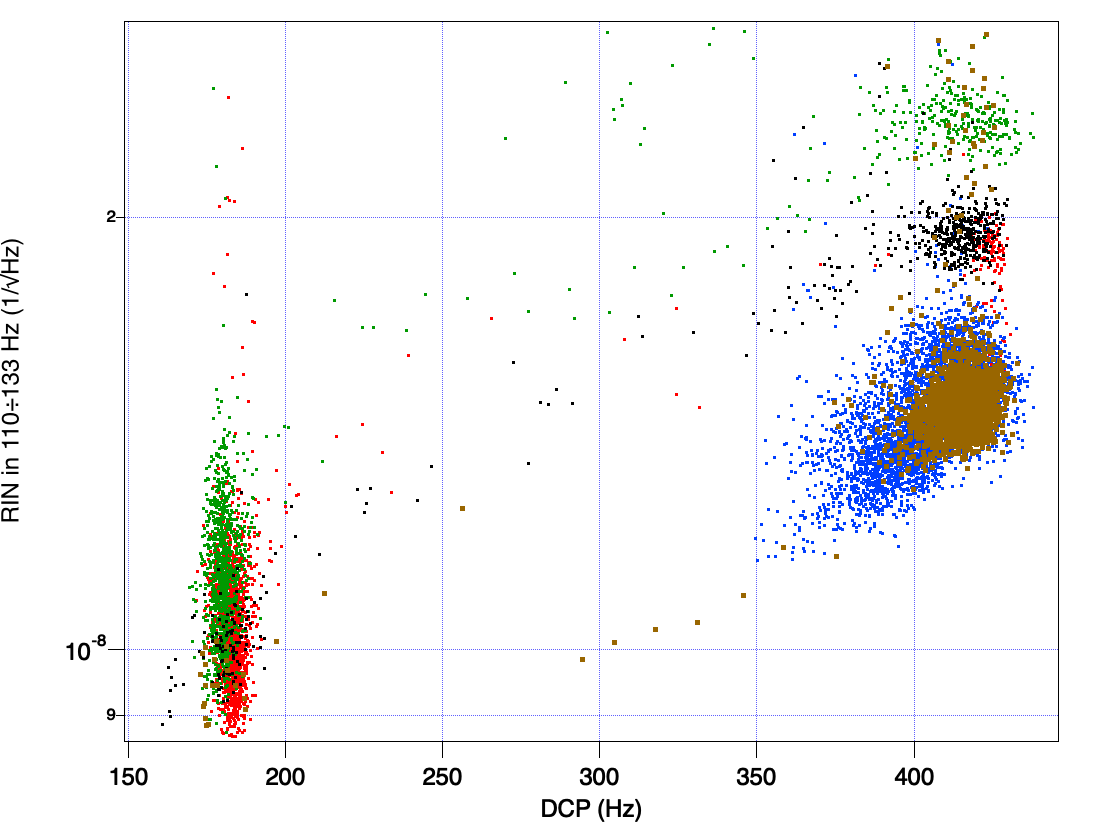 Fig 2 shows the same signals when the control of the base ring is closed. The blending between position and acceleration is about 40 mHz; the UGF of the loop is about 3 Hz. The base ring spectrum copies perfectly the seismic noise. The in-loop signal (yellow) is suppressed up to a factor of 40 and it is low also in the critical region around 0.1 Hz, where normally it is more difficult to have a good performance. The out-of-loop signal (purple) shows small and narrow peaks as residual motion above 0.1 Hz.