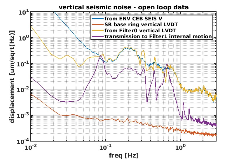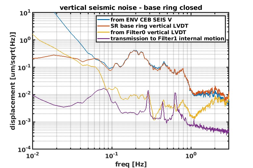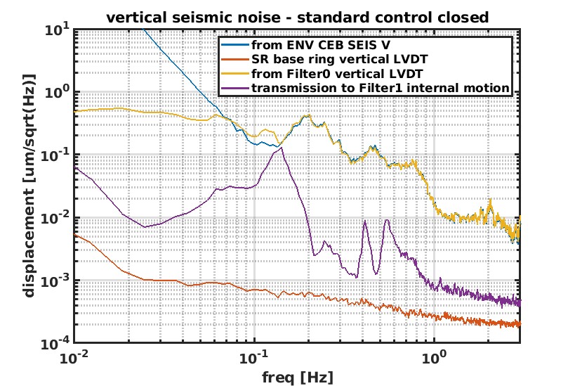 Fig 3 shows the same signals when the standard control of the topo stage is closed. The performance visible in the purple signal is much worse at 0.15 Hz. The peak corresponde to a notch in the plant of the control from the top stage, where the perfomance is expected to be lower. The mechanism of noise reintroduction needs to be better studied and understood. This is a lack of accuracy normally present in the vertical control of all the suspensions, but on SR is particularly bad. No attempt of loop optimization has never been performed and maybe it would be better to do something, but after having seen the performance of the base ring control, I think it would be worth to go ahead in that direction.
