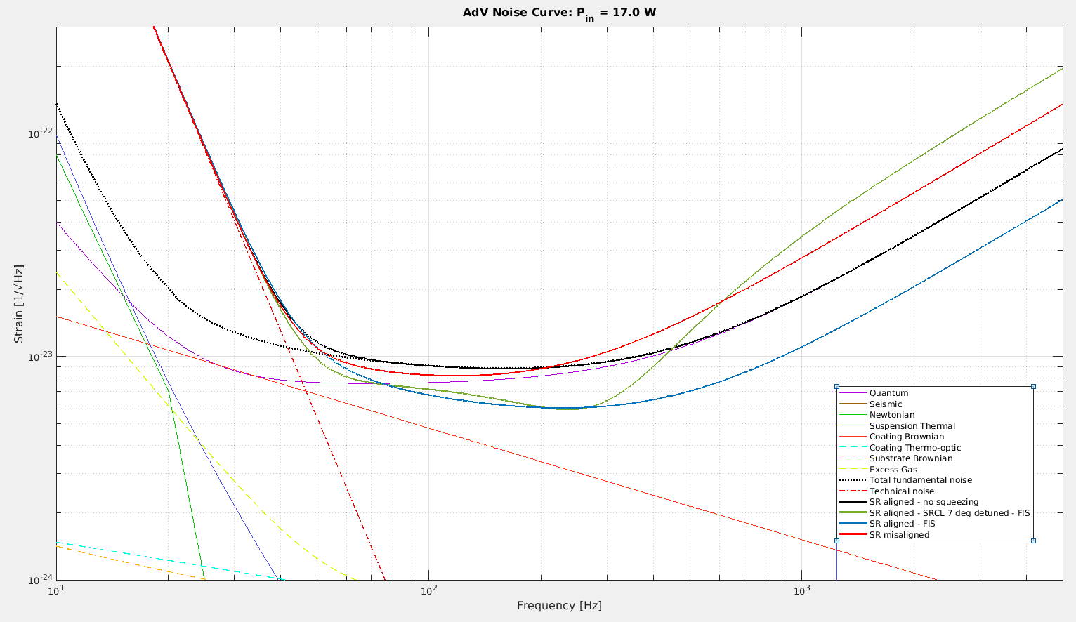 Figure 1 shows the result of GWINC for the current configuration, SR aligned and no squeezing, as a solid black line. In addition I have added the results of several other configurations. In green with SRCL detuned by 7 degrees and frequency independent squeezing with the phase adjusted by hand to make an improvement in shot noise between 50Hz and 300Hz. In blue the ideal case of SRCL tuned and FIS. And last in red a made up model of the SR misaligned configuration of O4 by adding losses and changing the SR reflectivity.