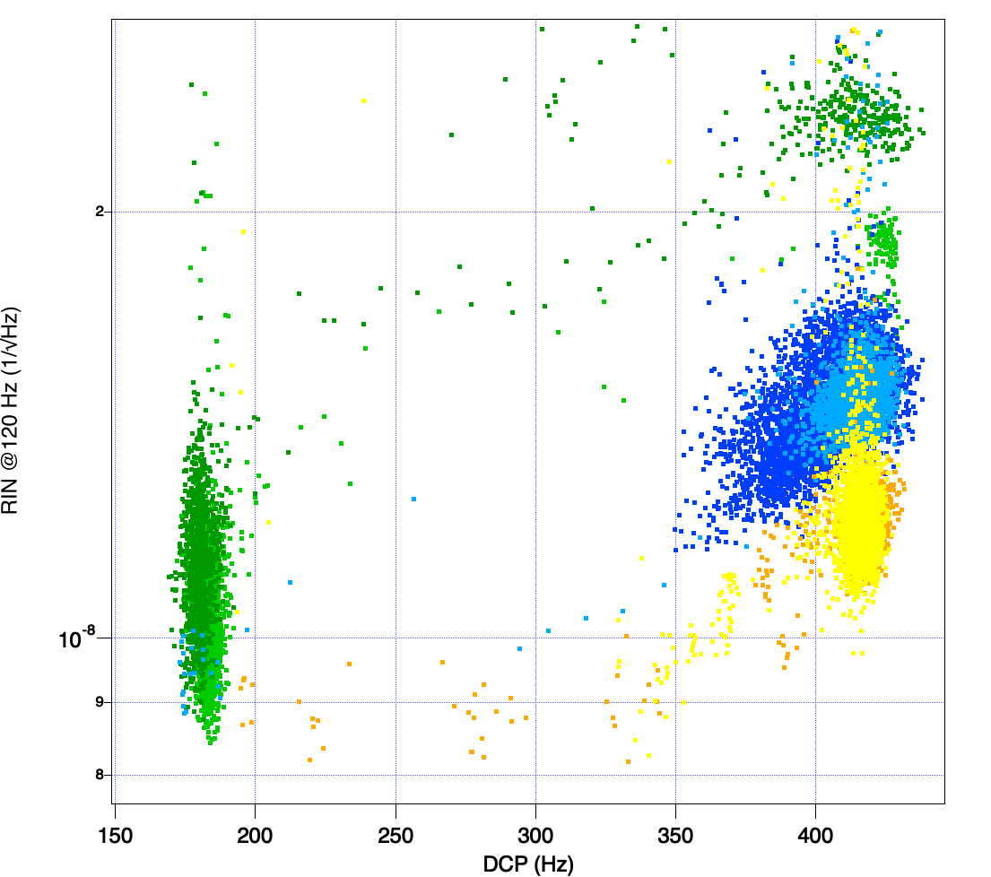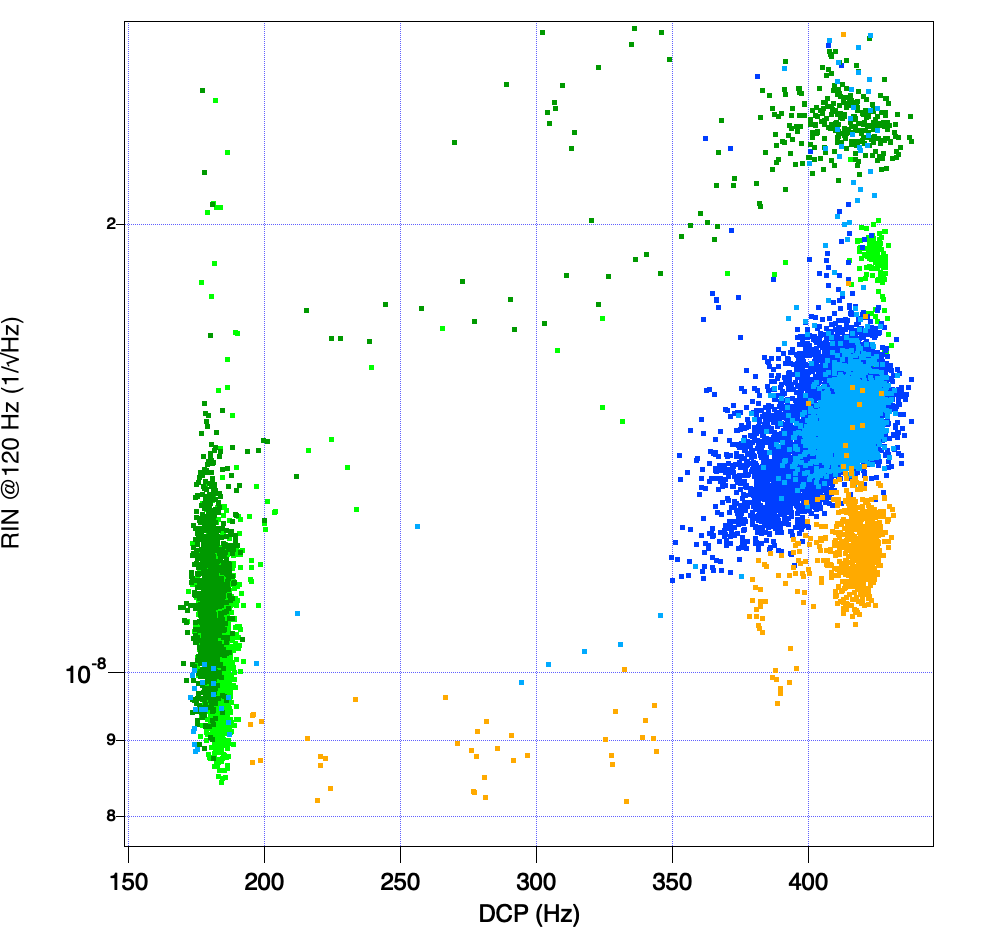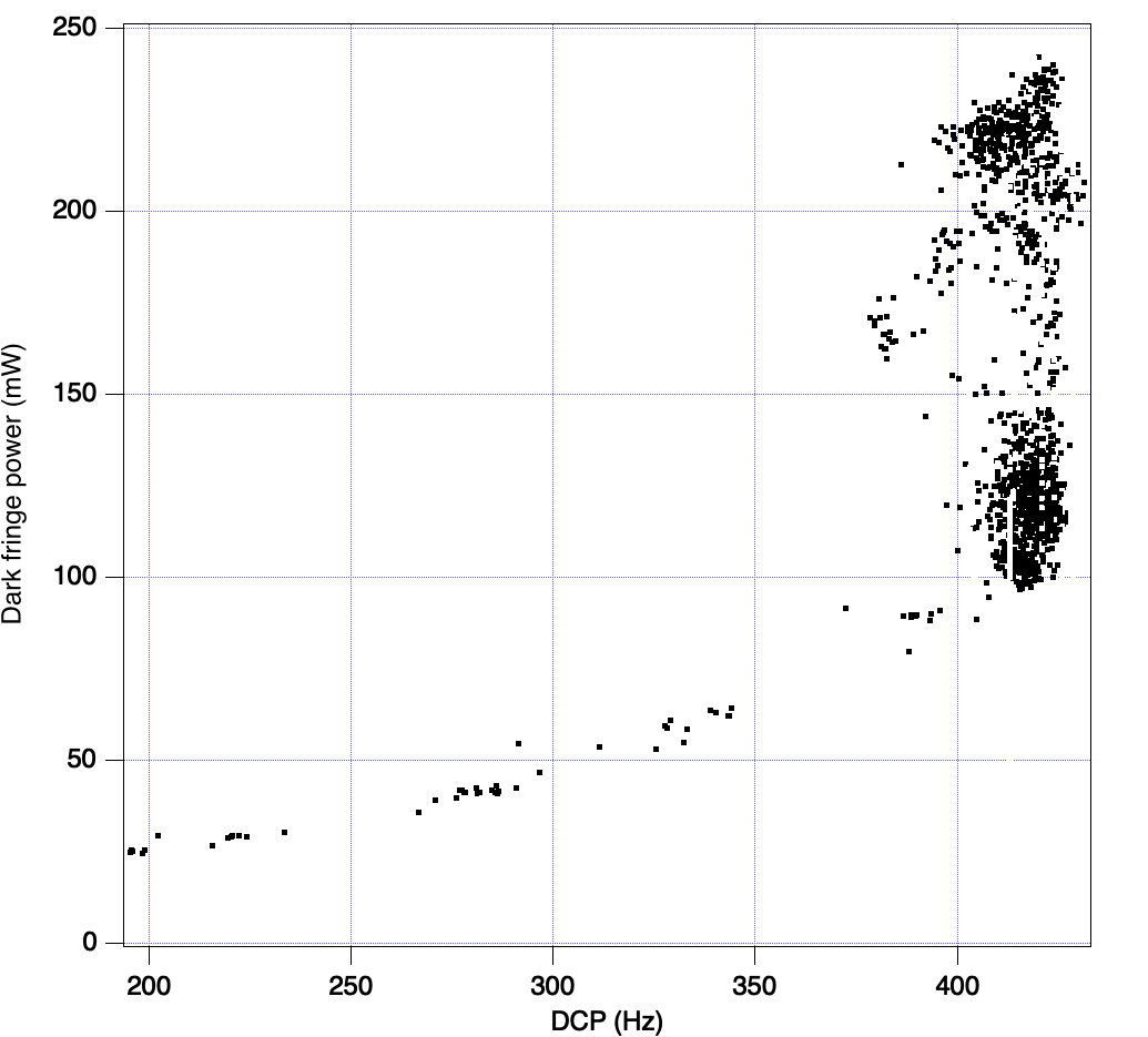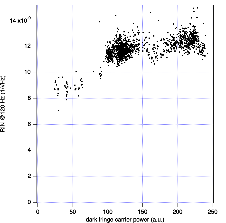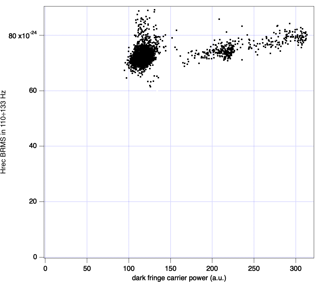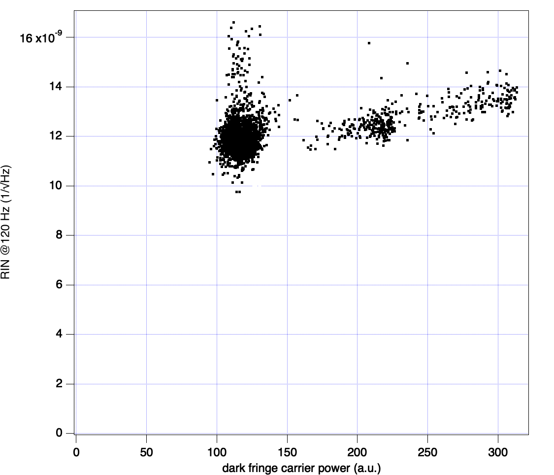 Data with 15 cm aperture offer a good chance to check the effect of contrast defect on broadband noise, as dark fringe carrier power varied over one order of magnitude. The seventh plot shows dark fringe carrier power versus DCP frequency. Dark fringe carrier power is computed as the product of calibrated B1p DC power and the fraction of carrier from B1p phase camera. The last two plots show the noise dependence with dark fringe carrier power for the data from February with 15 cm aperture. Broadband noise in power units changes by ~40% for a factor 10 change in dark fringe carrier power.