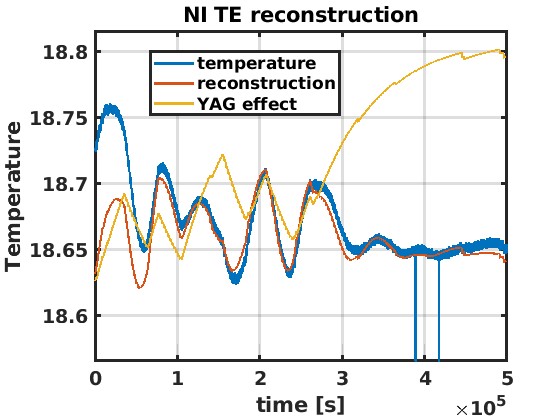 The reconstruction of the temperature measured by the in-loop temperature sensor, shown in fig 1 and fig 2, is based on two inputs and two model of response. One input is the correction applied by the loop: this is the square of the channel LSC_Etalon_NI/WI_HB_cmd. The signal is filtered using a model of the response of TM temperature to the power applied by the heating belt: two simple poles at 2.4e-6 Hz, gain 0.005 @ 0. The second input is the power in the arms, normalized in order to be 1 when the arm is locked in CARM NULL. The signals is filtered using model of the response of TM temperature to the power applied by the YAG: simple pole at 2.2e-6 Hz, gain 0.23 @ 0, for NI; simple pole at 4e-6Hz, gain 0.23 @ 0, for WI. The third component of the temperature trend is genereted by the environment, but this is unknown. Here we assume a constant variation and we fit a slope which optimizes the reconstruction. The parameters of the models used for this fit are slightly different from the ones used previoulsy, but the model of the loop does not change irs behaviour in a relevant way.