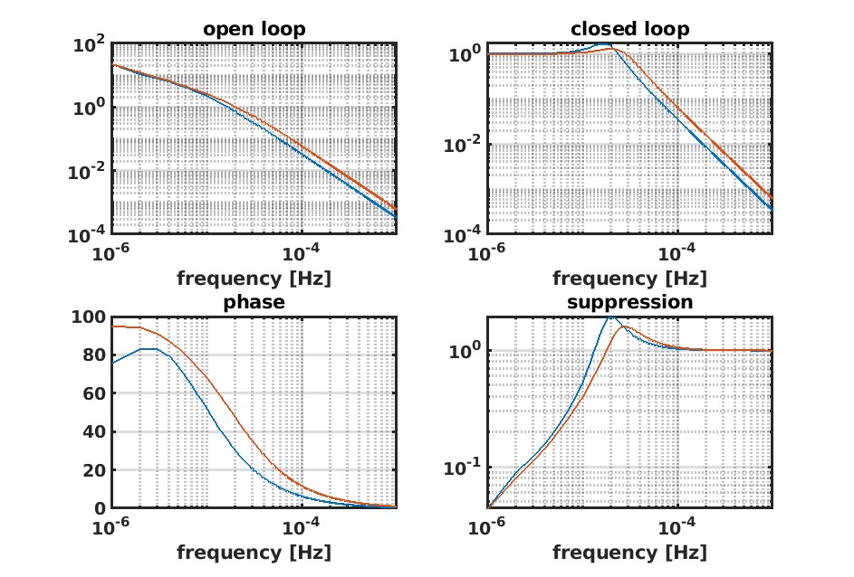 The phase margin is limited by the presence in the controller of a pole at 10 uHz. When the controlled was changed from as simple integrator to a more complex design, a safe choice in terms of roll-off was done, having no idea about the possible impact of an increased high frequency component in the correction signal. I think we should try to move upwards the pole. In fig 3, we see the effect in the phase and the suppression if the pole is set at 20 uHz: the overshoot is reduced and moved to higher frequency, where the amplitude of temperature oscillation due to lock/unlock would be lower (shorter period means less time to accumulate temperature variation). The new filter has a gain 4000 @ 1Hz, instead of 2200.