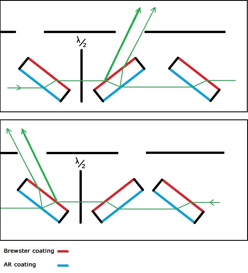 We installed the new polarizers from LMA in the IPC system on SIB1. The resulting throughput was less than expected. After optimization we measured a throughput of around 94%, or 6% losses in the IPC. The main culprit is the polarization coating that appears optimized for 57deg, not for the Brewster angle of 55.4deg. The mechanic can not accommodate the polarizers at that angle. We oriented the polarizer for avoid clipping for the most powerful beams. We allowed for clipping of the low power reflections from the AR coatings, considering that they are at only 1350ppm, or less than 35mW for 25W input power. The new IPC configuration is shown in the attached picture. The mechanical design will be changed as soon as possible, but the current configuration seems acceptable for the first phase of AdV commissioning. We also measured a really good polarization quality of more than 39 dB at the output of the IPC. Currently, The suspended injection bench SIB1 is completed except 2 baffles expected to arrive soon.