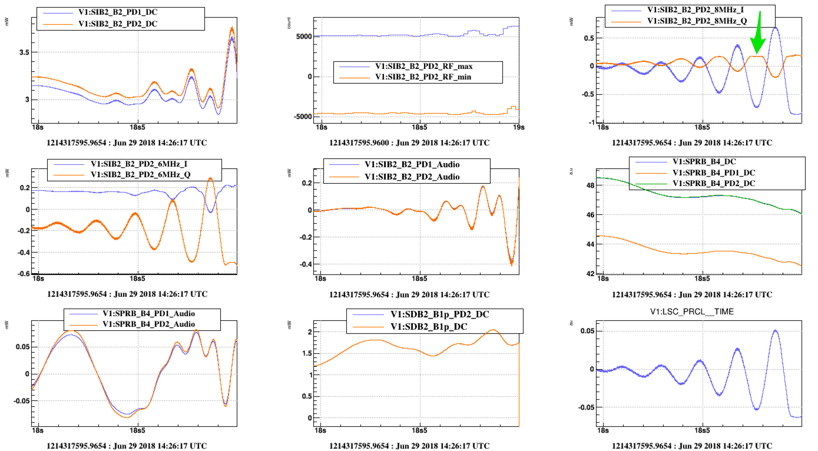 The first plot is showing various signals before the unlock. There is a low frequency oscillation (0.6 Hz) that does not help. But if you zoom a bit near the unlock (second figure), and check the top left plot, you see saturation on the B2_8MHz signal (see the green arrow). Of course, you may think that the fast ADC is not saturating (counts around 5000, far from the 8192 ADC limit), but here the VGA gain is low and this is the preamplifier that is saturating.