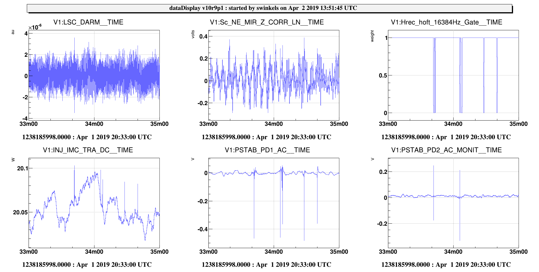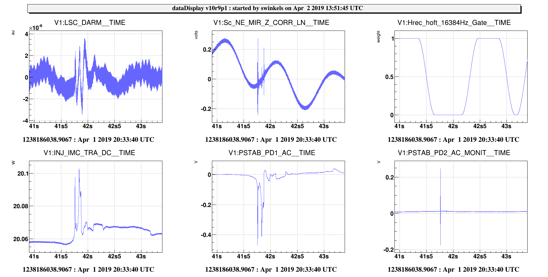 We notice that the glitch is visible on all signals and with the same amplitude as in IMC_TRA. This means that any feature due to true misalignment would be a small fraction of IMC_TRA RIN, that is much less than 0,2%