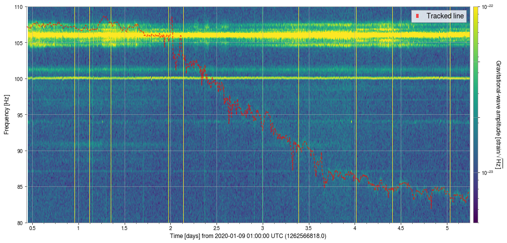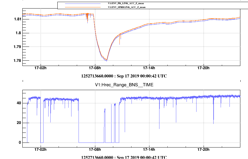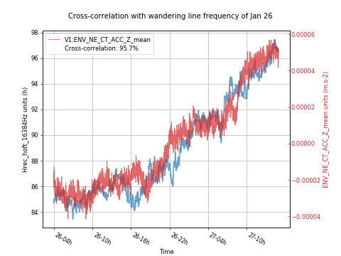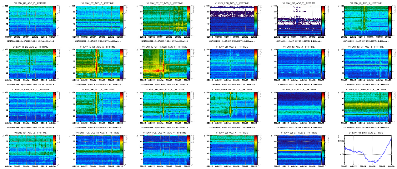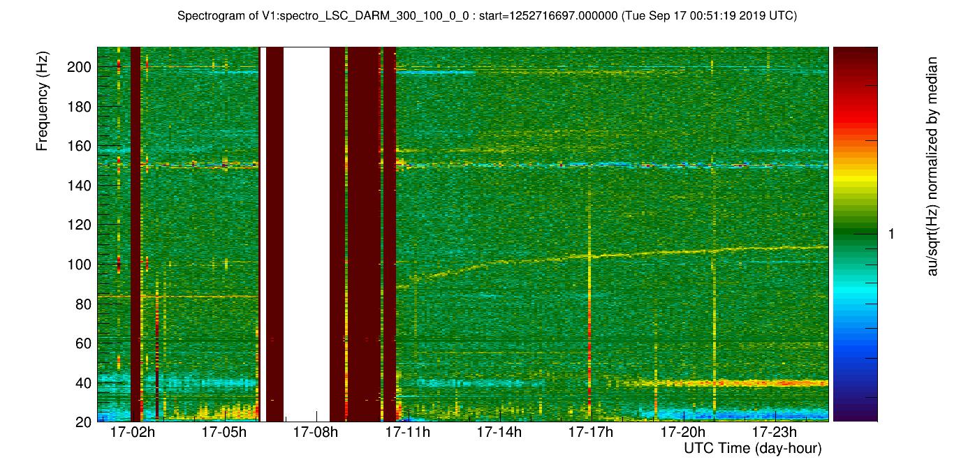 On September 17, after the maintenance break in the morning, a spectral line that use to stay stady at 83.5 Hz started moving in frequency, rising to 108 Hz. See the attached median normalized spectrogram of LSC_DARM and the ASD of Hrec_hoft_20000Hz.