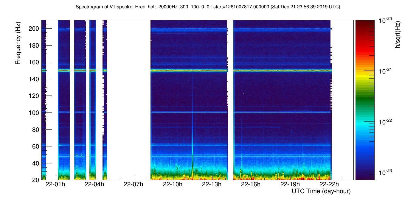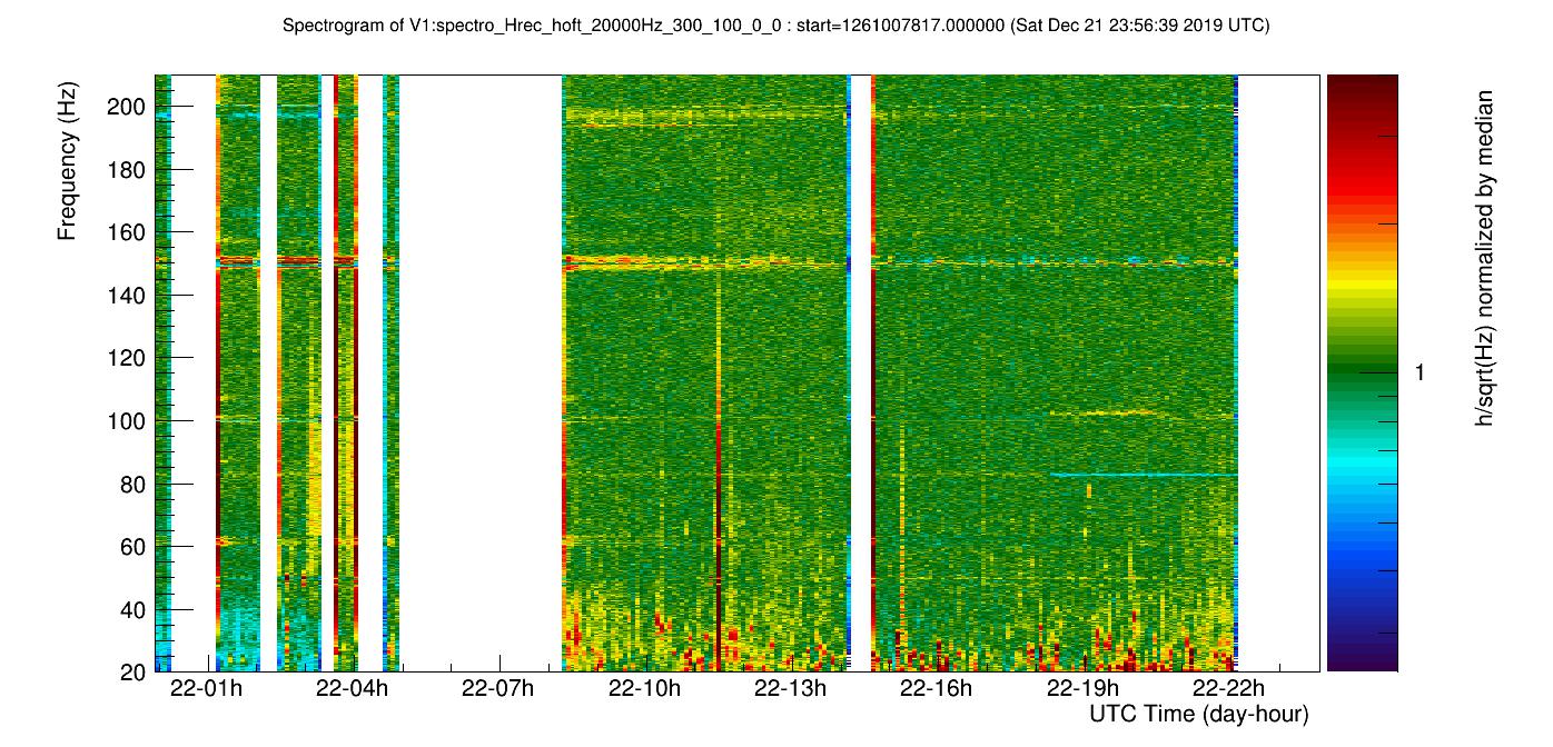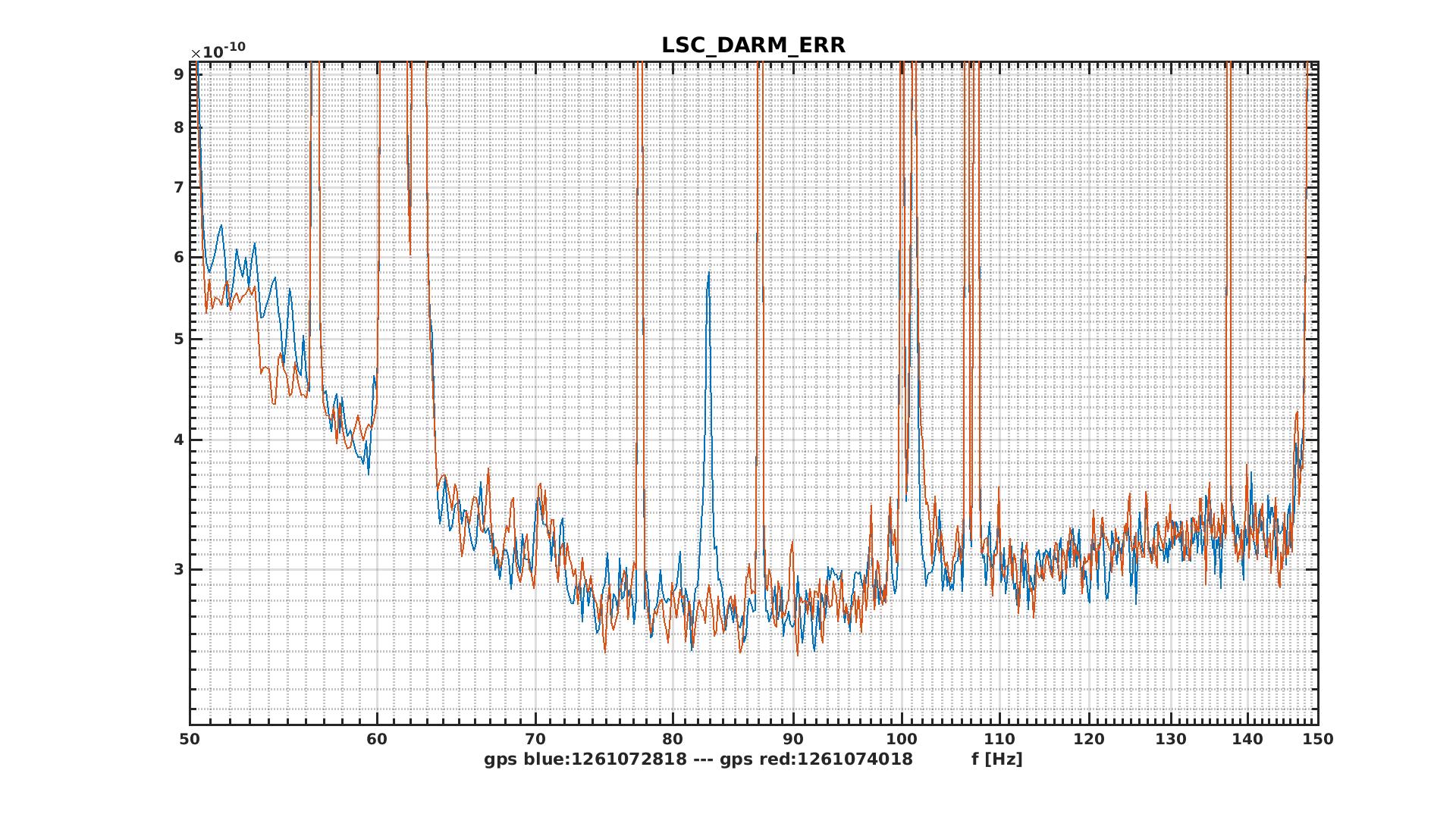 The spectrogram of Hrec shows a sudden change in the sensitivity on Sunday at 18:20 UTC: a line at 82.7 Hz has disappeared (fig 1, fig 2, fig 3). The same thing is visible in DARM (fig 4).