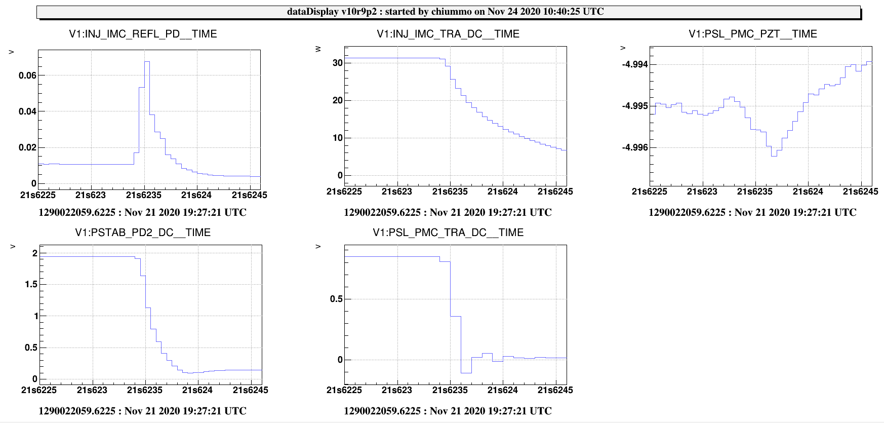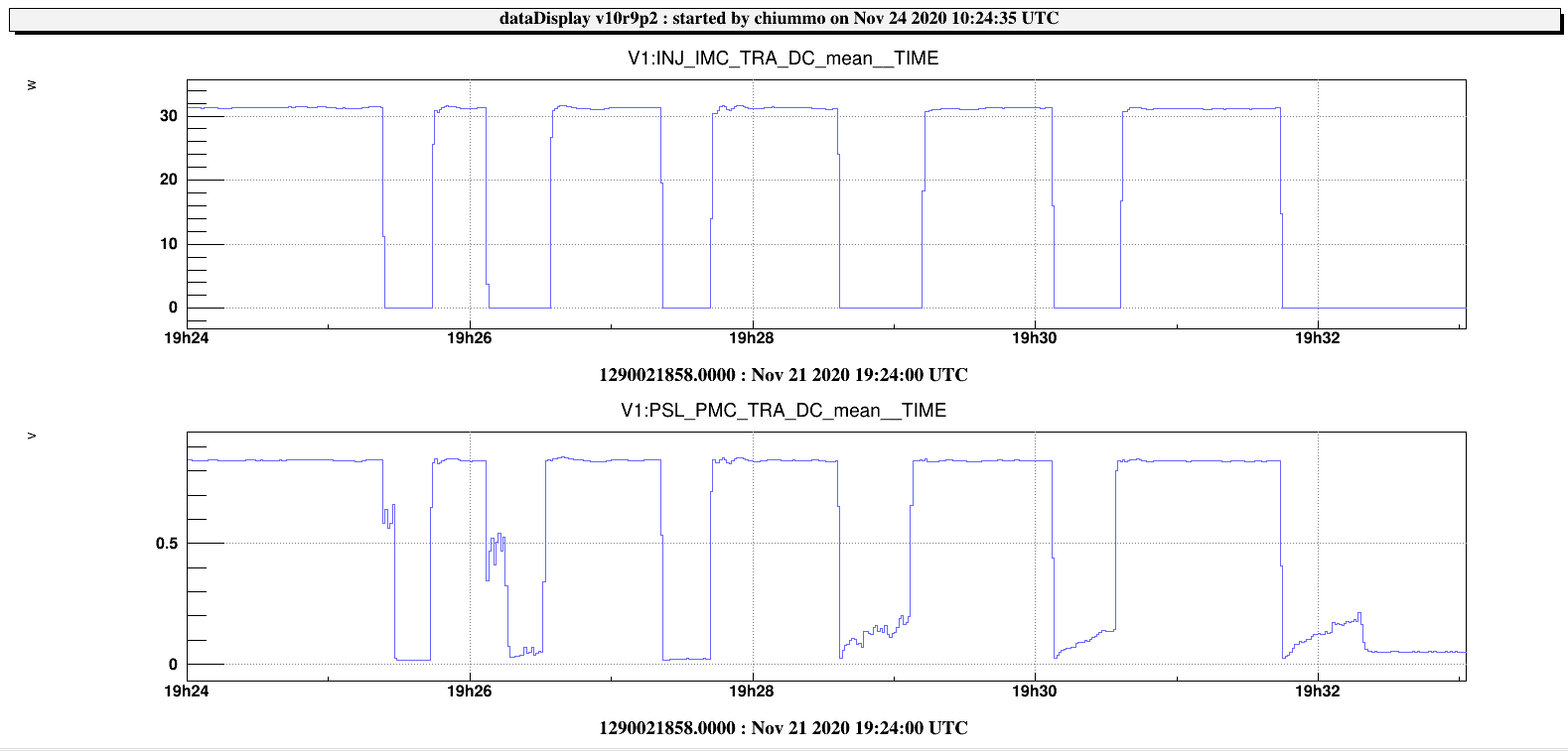 In orer to measure round trip losses we manually unlocked the PMC a few times to have the decay time of the IMC cavity (see first plot). Data strech from 19:25 to 19:32 UTC of Nov 21. Data were not as "clean" as we collected back in september, analysis is ongoing (see second plot for a close-up on one of the unlock). In particular, as for september measurements, the photodiode on IMC_TRA (thorlabs commercial) shows a decay time that is too long and is not compatible with the upper limit of decay time set by the dihedron transmittance, so we use PSTAB_PD2_DC to estimate the decay time instead.