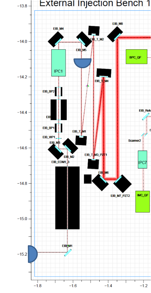 Also, we tried to measure the power at the input and output of the EIB with the same powermeter head (see pictures: first at the input of EIB, second after EIB_M5, diagram summarizes the positions of the Ophir powermeter). The measurements were performed with the EIB blocked, so we can have some residual misalignment of the bench, with a little impact on the overall output. Results are: 50.1W at the input of EIB, 39.5W at the output after EIB_M5, so around 20% of losses while we expected less than 10%.
