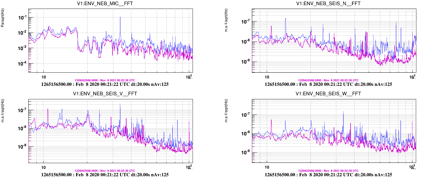 The first attached figure compares acoustic and seismic noise of the NEB experimental hall and tower platform (Guralp sensor) now (purple, Nov 9 2021) and in O3 (blue, Feb 8 2020). The noise reduction in the band few Hz to about 100 Hz is evident in all sensors. Note also that the actual noise level it is essentially everywhere below the O3 noise.