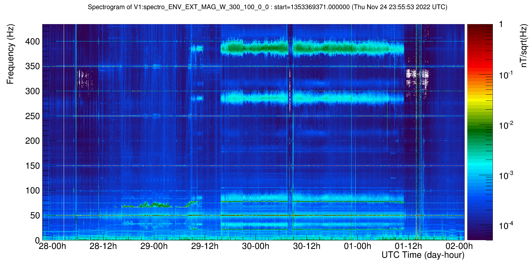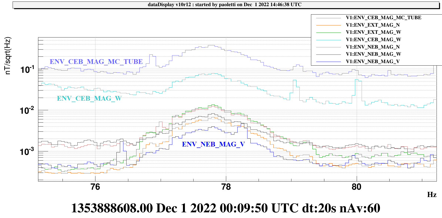 This last noise seems originated inside Virgo, because it is louder as seen into the MC vacuum pipe ENV_CEB_MAG_MC_TUBE (0.4 nT), then following ENV_CEB_MAG_W (0.08 nT), and last all others like MCB or EXT or NEB magnetometers (< 0.02 nT) - nothing is visible in ENV_WEB magnetometers.