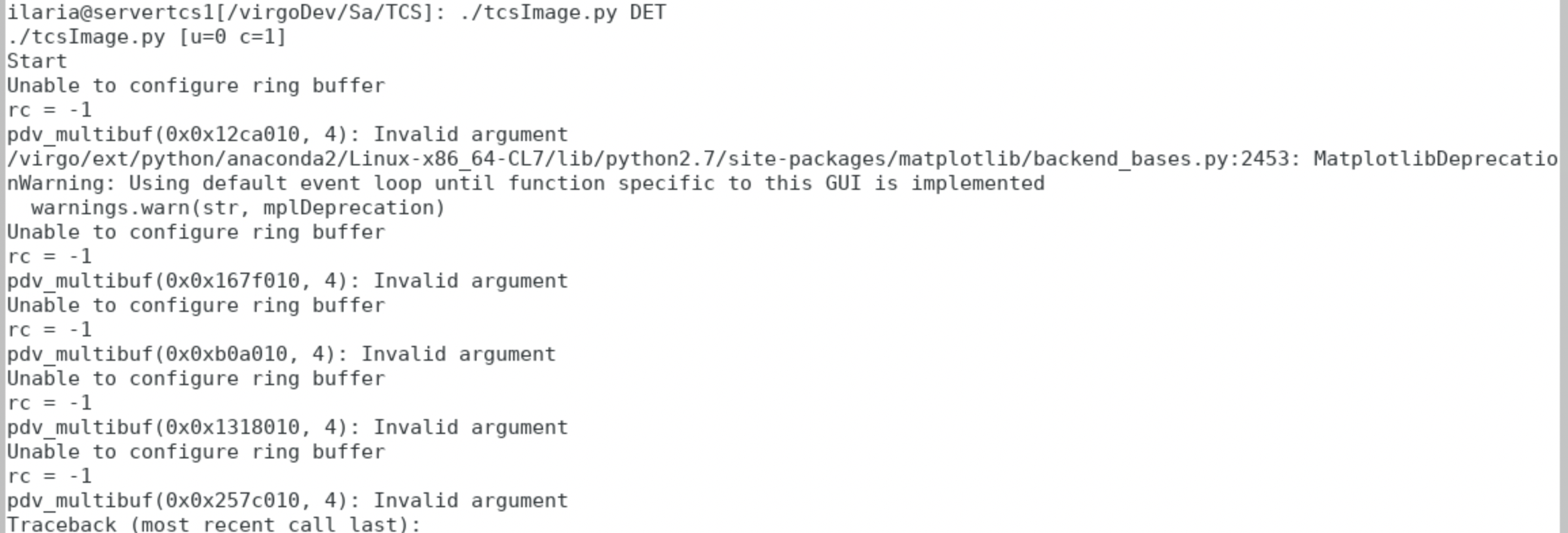 We did a few tests and they were all successful but the last, long one we launched, where a new, different kind of issue arose: we got up to wavefront acquisition #90, where the HWS (the DET one) stopped acquiring the images at number 42 (of 100), thus stopping there without generating the wavefront nor carrying on acquiring the images. Despite this new issue, the hwsAna process was still alive on servertcs1. At the same time, the HWS was not visible online (via the tcsImage.py script).