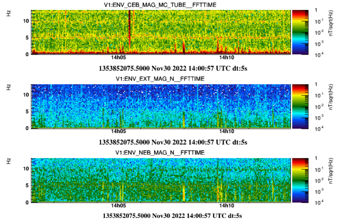 We noticed that these transients are correlated and coherent in all magnetometers: external magnetometers and magnetometers inside buildings. They look the most intense in the magnetometer we recently repositioned on top of the MC tube. Figure 2 shows 1hour typical spectrograms of all magnetometers where the correlated transients are visible. Figure 3 is a zoom-in.