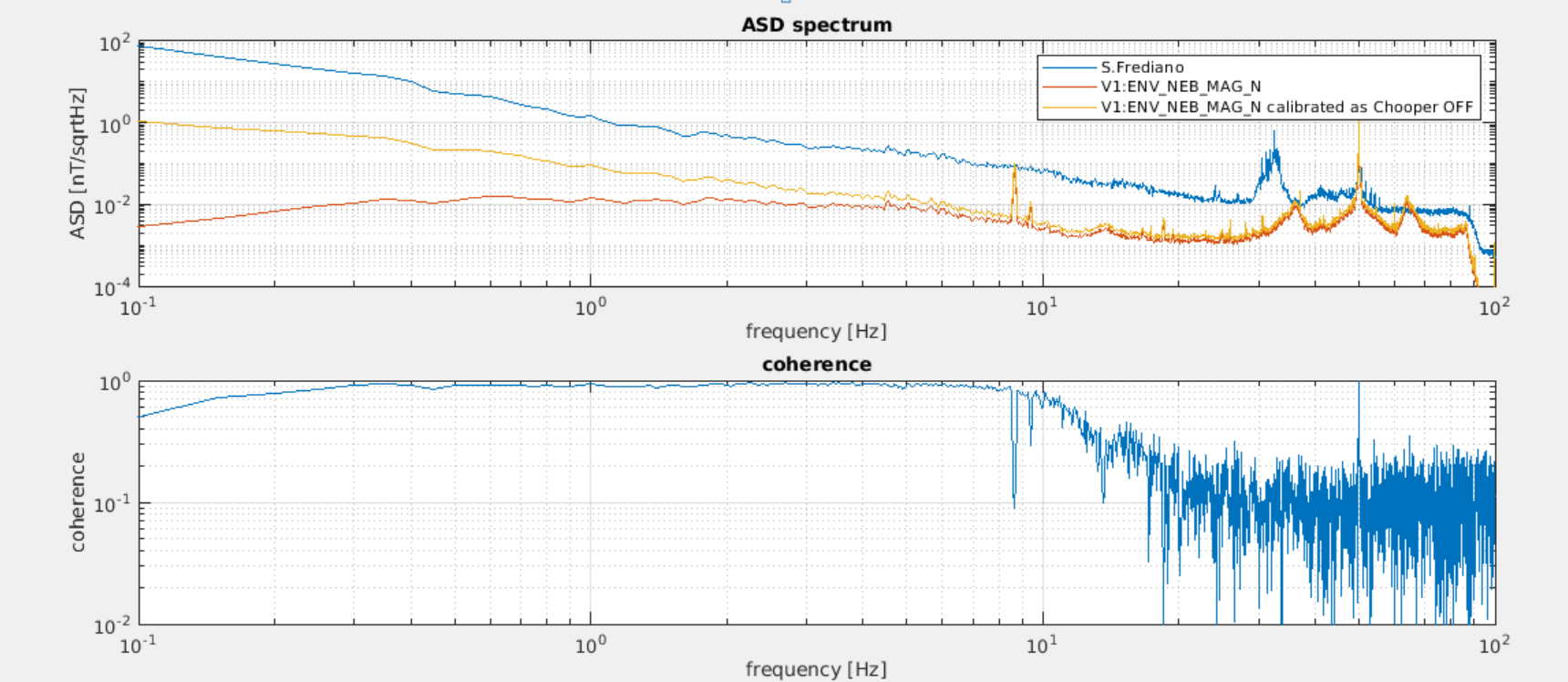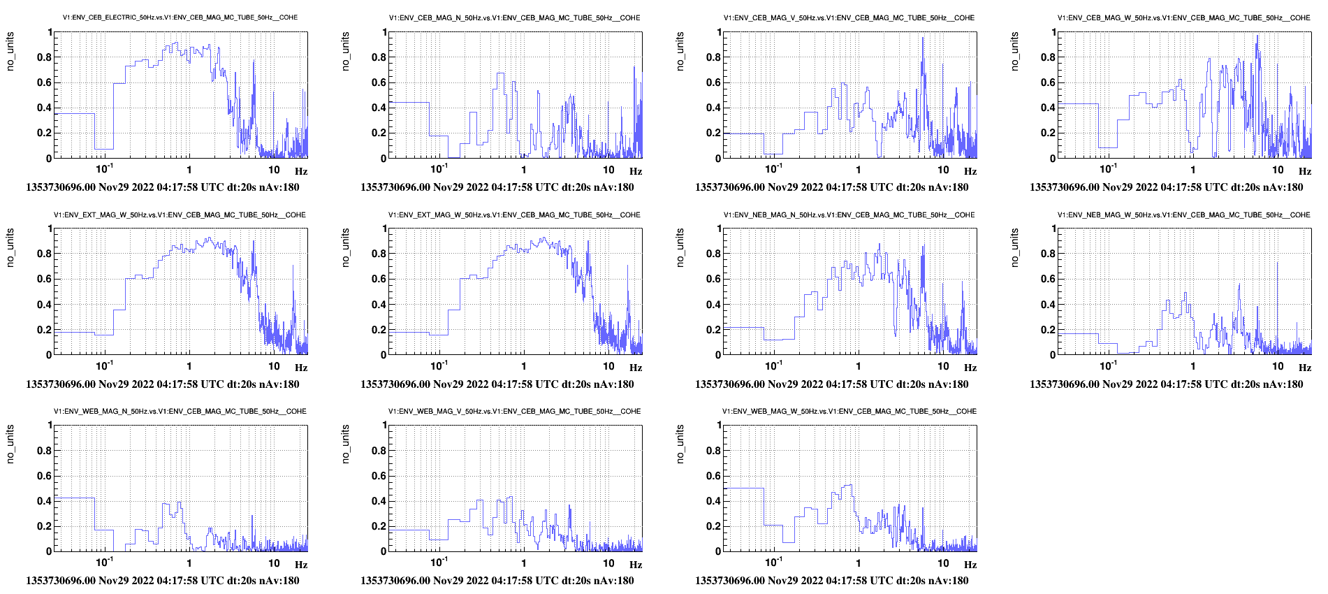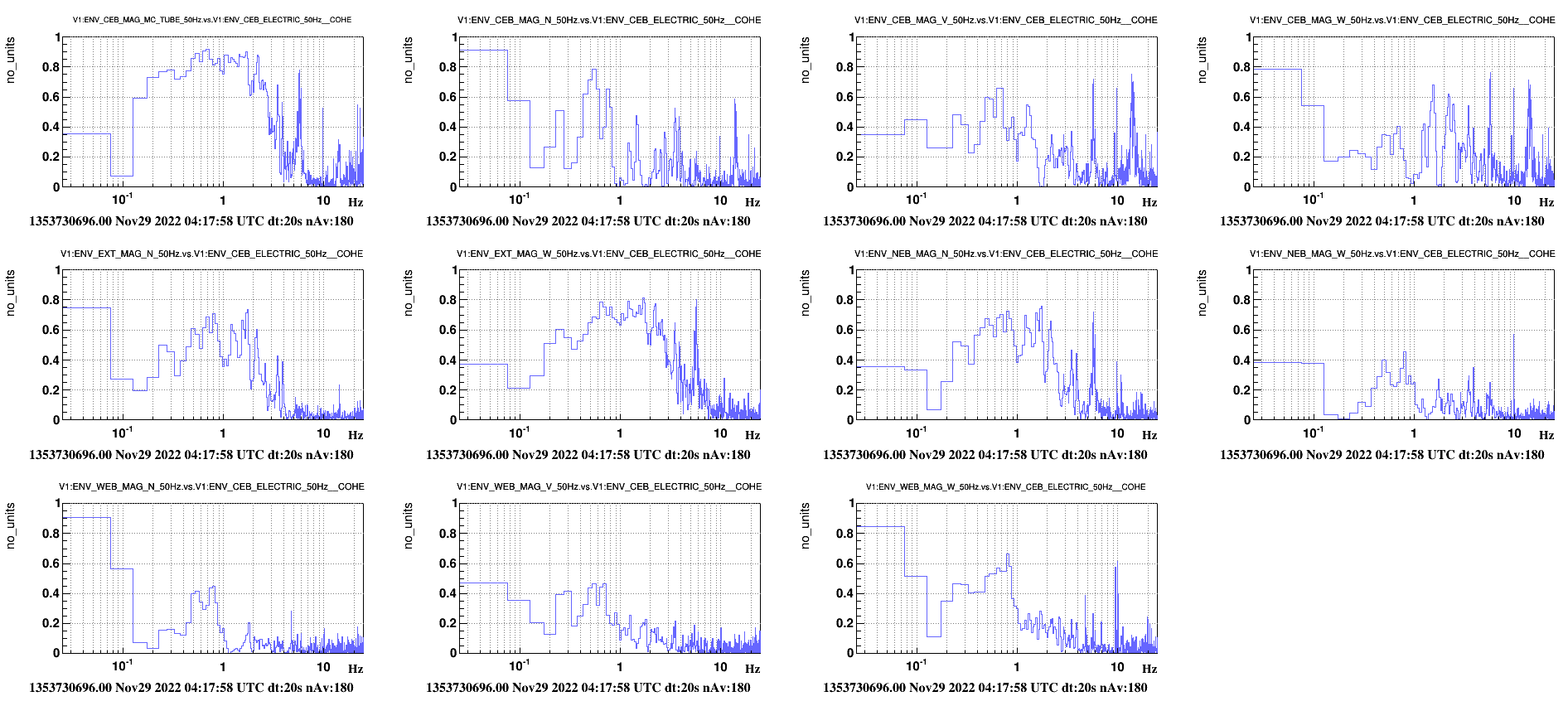 Figure 4 shows coherence between the MC tube magnetometer and all others. Good coherence is also present with the sensor CEB_ELECTRIC that monitors the voltage drop between the Virgo vacuum steel tube and the mains Protection Earth system, this is shown in Figure 5.