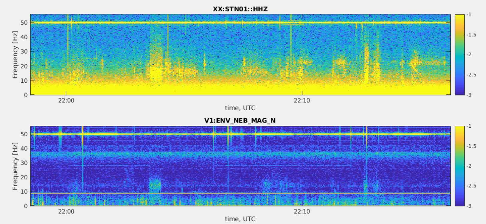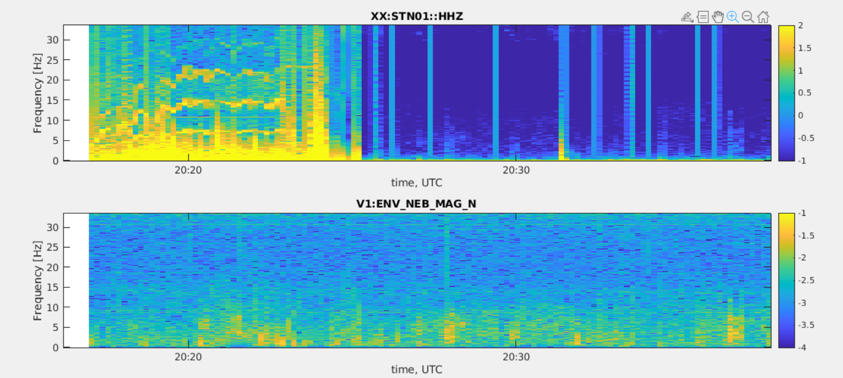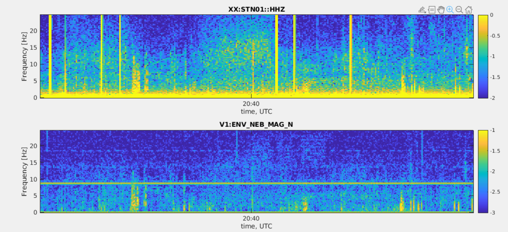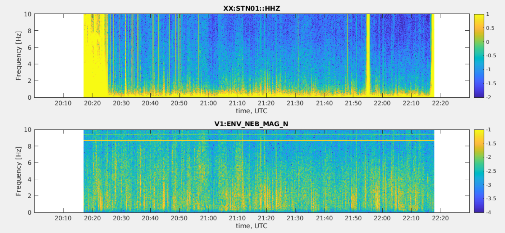 We know that our environmental magnetic noise below about 10 Hz is dominated by transients with quiter periods occurring daily between roughly midnight and 4AM. Figure 1 shows one typical VIM spectrogram of one NEB magnetometer. This noise is particularly evident at the NEB magnetometer, where transient noise tails extends also above 10Hz.