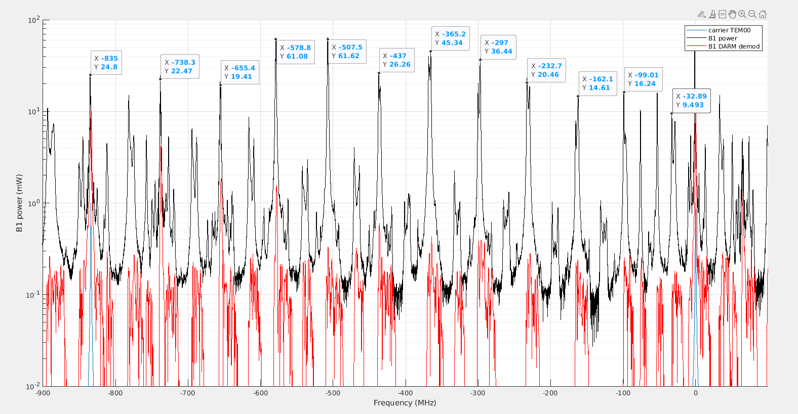 Figure 1 highlights the carrier order 0 to 11 modes. The order 1 and 2 mode seem to have more DARM signal, it could be that the SR RoC tuning has changed the OMC alignment offset on B5. But the second order 1 peak in that scan (see figure 3) has 4 times less DARM line signal, at similar level to what was on Saturday, so it could be just an alignment fluctuation while going over the order 1 mode.
