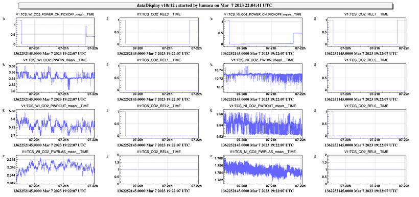 In Fig. 1, the reduction of the power visible in channel “TCS_WI_CO2_POWER_CH_PICKOFF_mean” immediately after the flip mirrors were open, was an action performed manually, to restore the current value of WI CH (= 0.065 W), that was previously raised up to 0.165 mW to ease the HWS-INJ SLED beam re-alignment attempt. It will not affect the HWS-DET compensation measurement since it involves the WI TM.