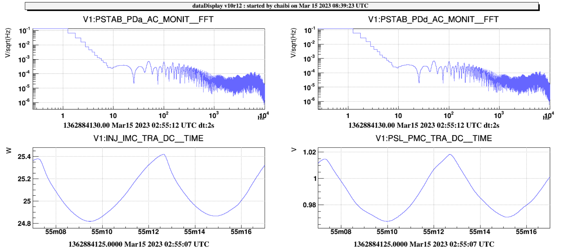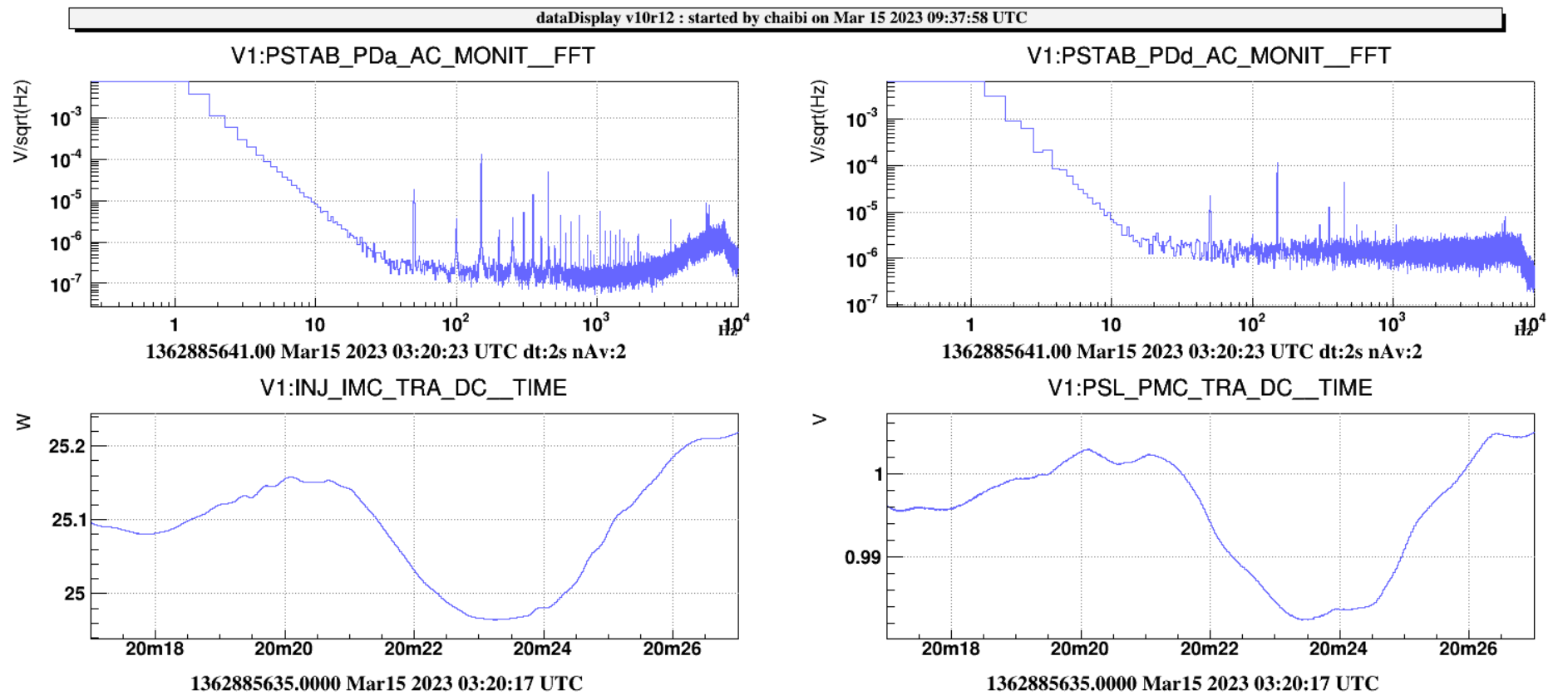 Currently, PSTAB is at its nominal value (see figure 1) but undergoes some glitches (see figure 2) which corresponds to an increase of the noise of 1 to 3 orders of magnitude. This saturates the Pstab electronics which makes the power (PMC_TRA, IMC_TRA,...) to oscillate by 2-3%pp over few seconds. The origin of these glitches is still unknown but seems to be correlated with the IMC loop gain. Another test to be conducted is to use on of the 2 other photodiodes for the Pstab loop.