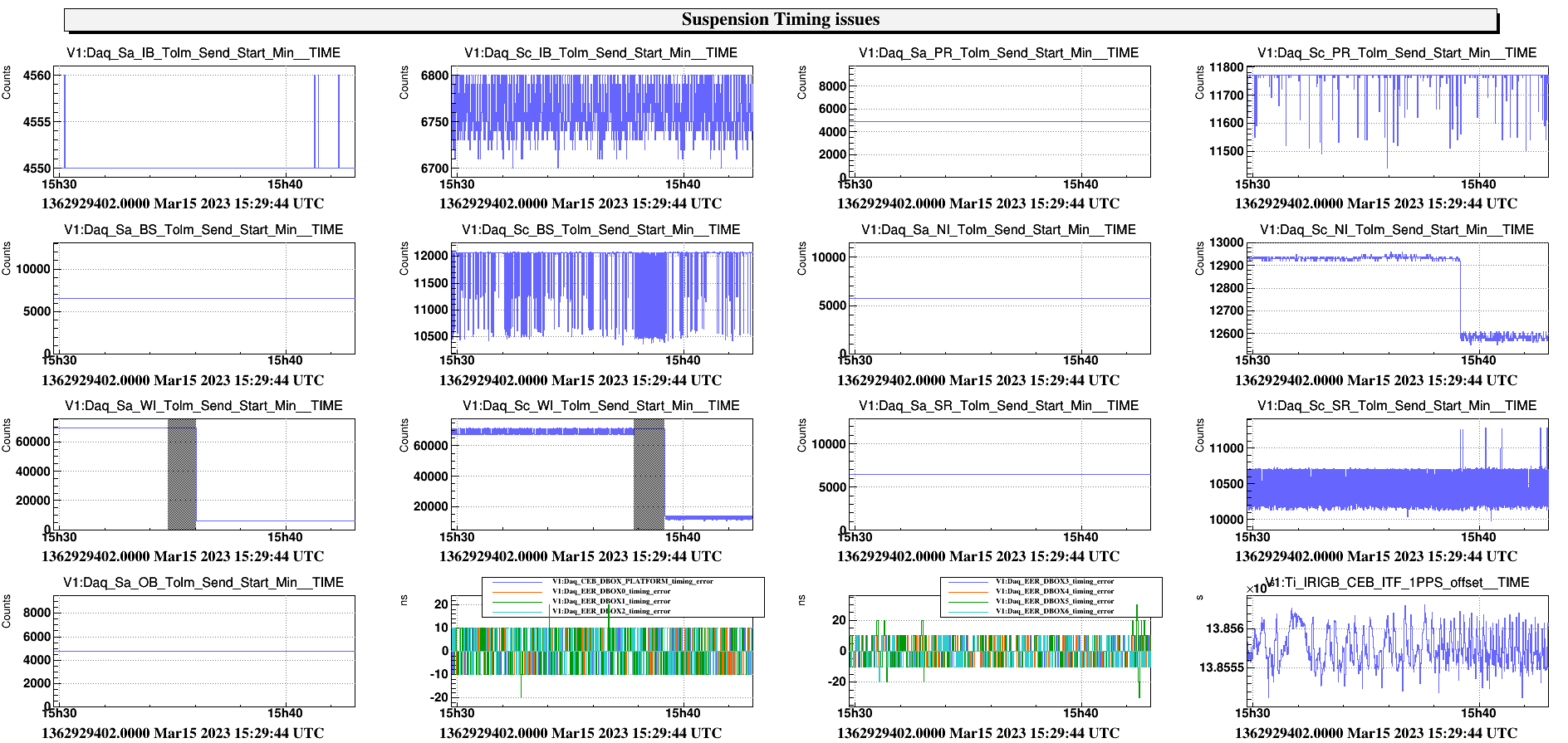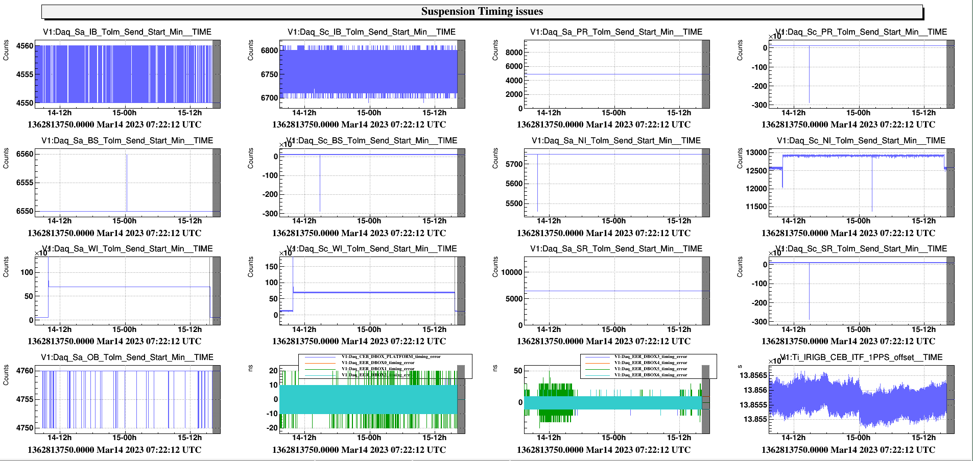 The attached plots shows the differents Daq_S{a,c}_XX_Tolm_Send_Start_min signals, the timing _error signals of the DAQ boxes located in the EEROOM, the DBOX located in the CEB platform and the monitoring of the IRIGB pulse at the level of the first TDB04B . The red rectangle highlight the suspensions where there was some timing jumps : Sc_BS, S{a,c}_NI, and S{a,c}_WI. There was 2 jumps space by 4mn . The jump level was not the same on all these suspensions, the big jumps occurred only on the WI suspension DSPs .