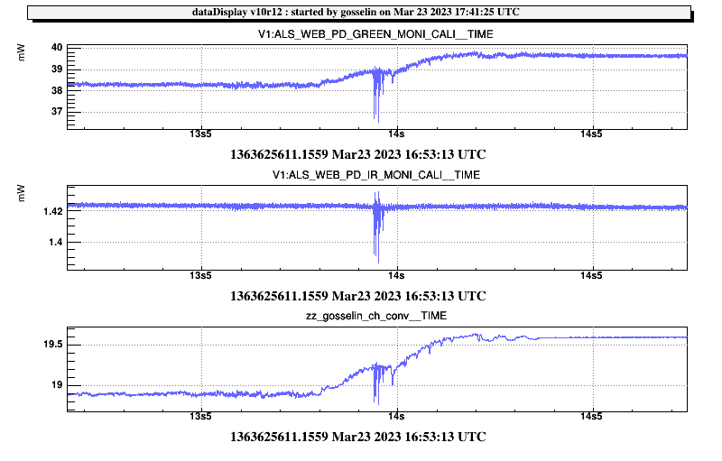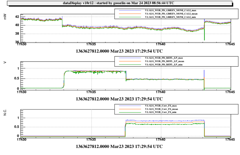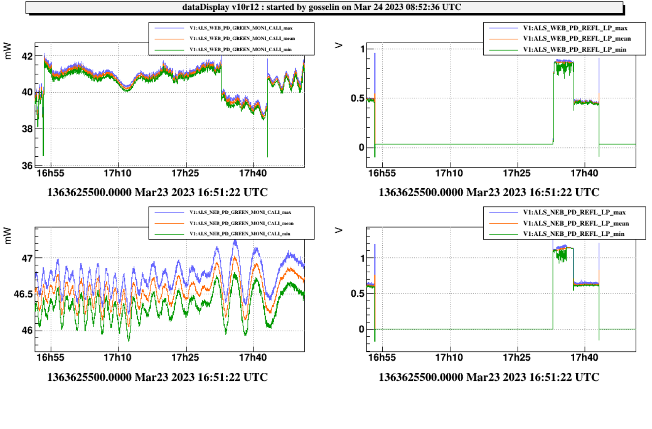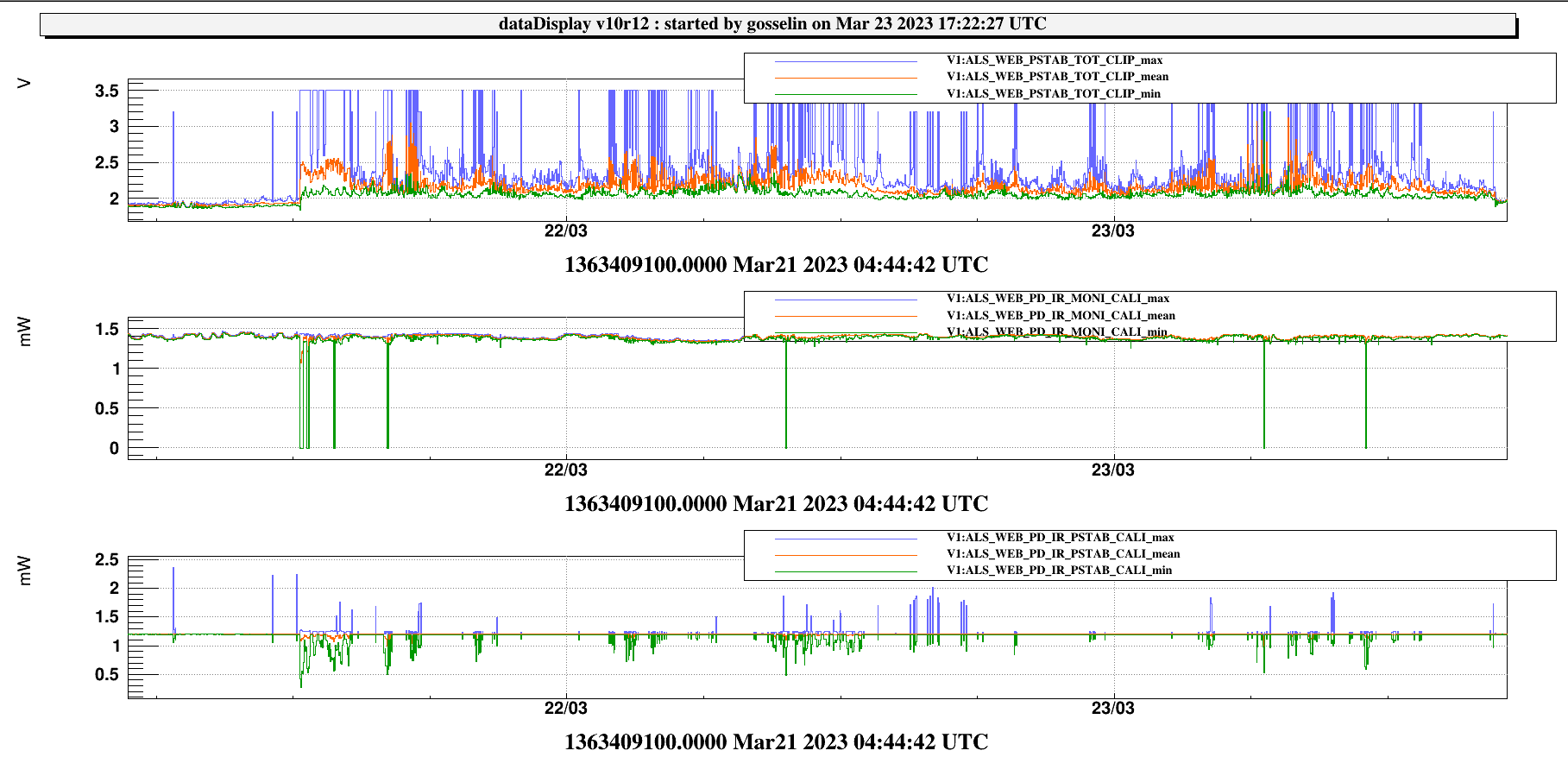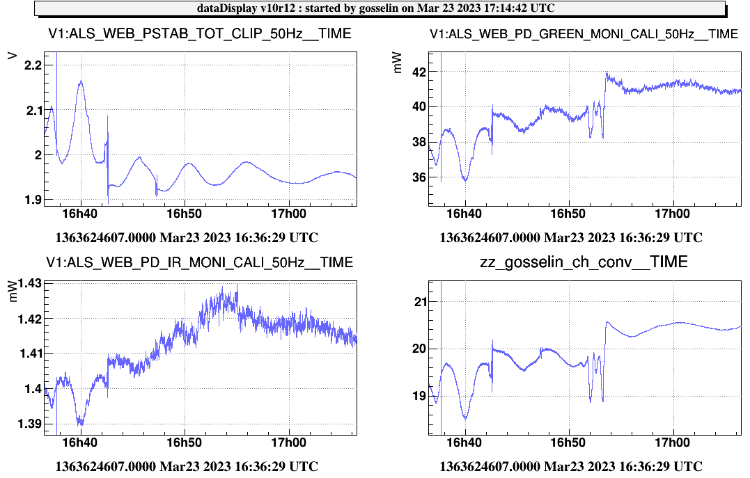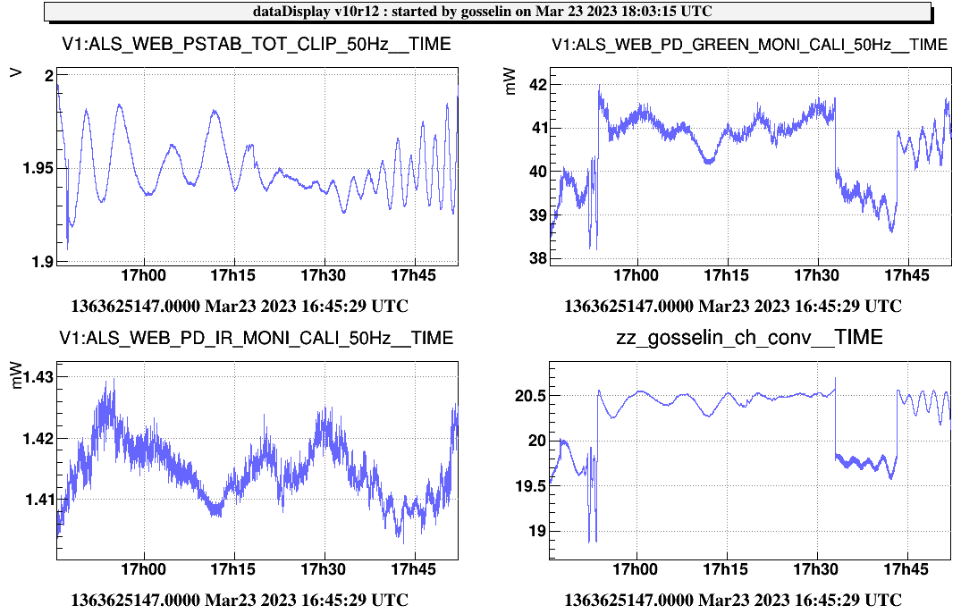 I noticed that the correction of the PSTAB at WE were oscillating quite a lot since Tuesday. This is symptomatic of a lack of power reaching the ALS elec box. As a consequence, sometimes the 2W amplifier was not seeded with enough power and its internal securtiy was switching it off (plot 1)