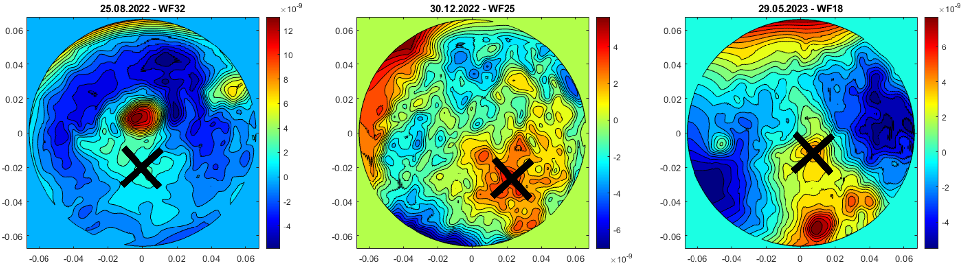 Here is the report of the preliminary analysis of the WI WFs collected on May 29th during the cooling phase (60362). As done in the past, we looked at the first WFs right after the unlock to search for possible PAs. The situation is well summarized in figure 1, that shows three WFs of the WI taken at three different dates: August 25th, 2022 - December 30th, 2022 - May 29th, 2023. In all cases, the black cross indicates approximately the mirror center, and the coordinates (in meters) of the maps are in the ITM reference frame.