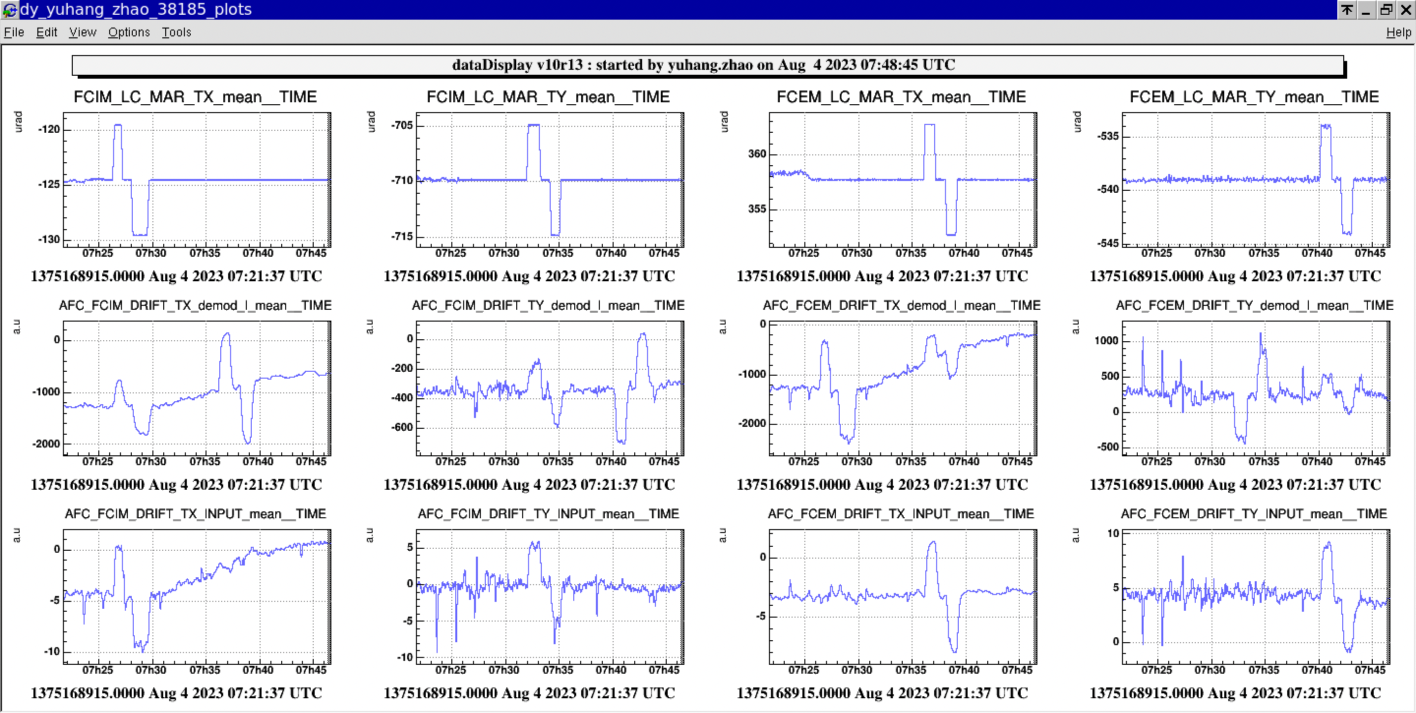 The precision of the dirthering control loop is characterized using the period when the filter cavity is continuously locked. The GPS is 1375487418.0, and duration is 3600 seconds. In this period, the precision is estimated from channels 'AFC_FCI/EM_DRIFT_TX/Y_INPUT_mean', their values (the standard deviation value) are as following