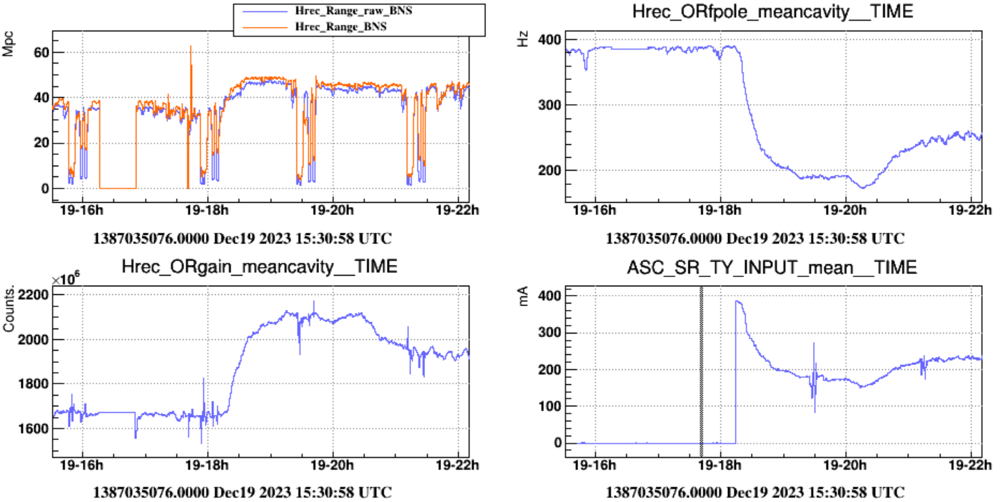 Plot1 shows the BNS range, the pole frequency estimated by Hrec, the optical gain estimated by Hrec and the SR_TY_INPUT values, all along the CAL shift.