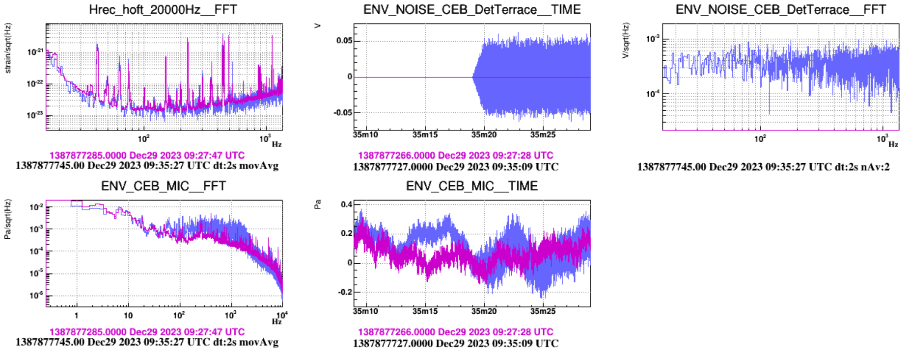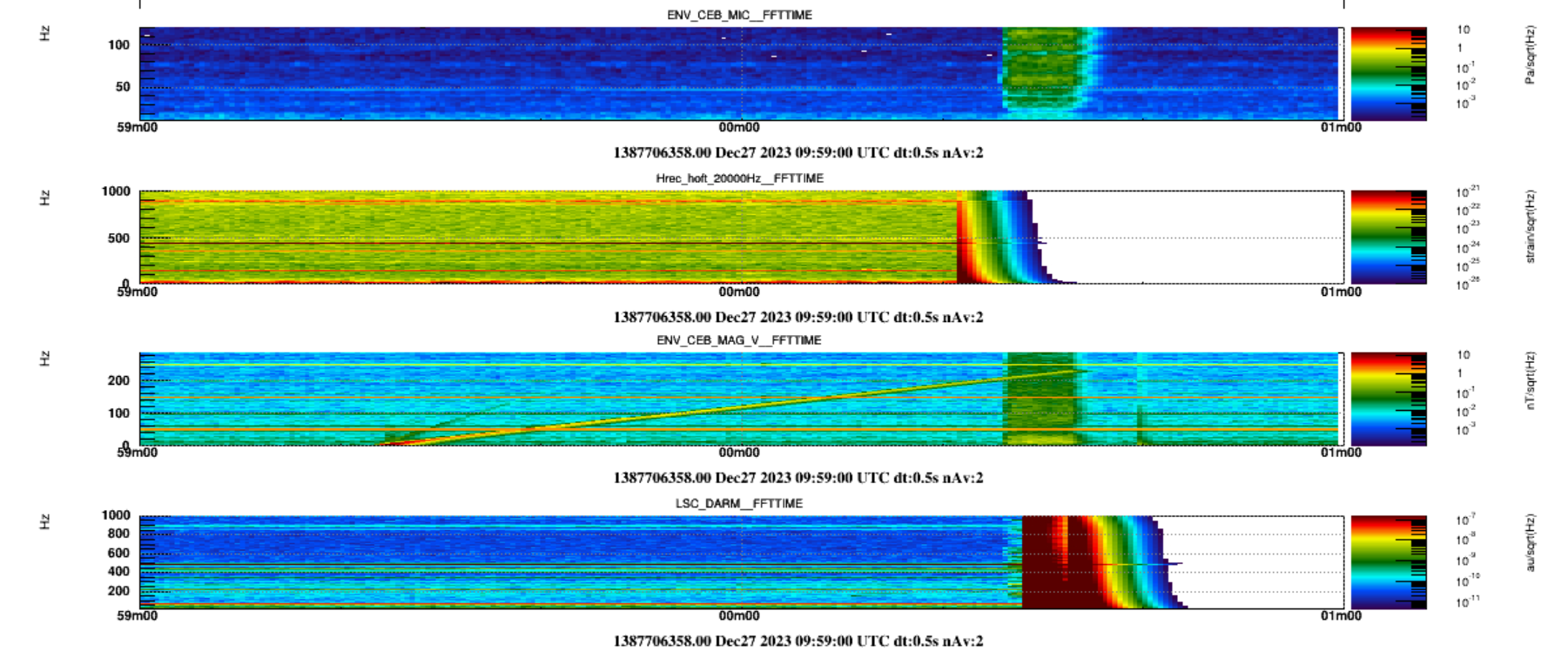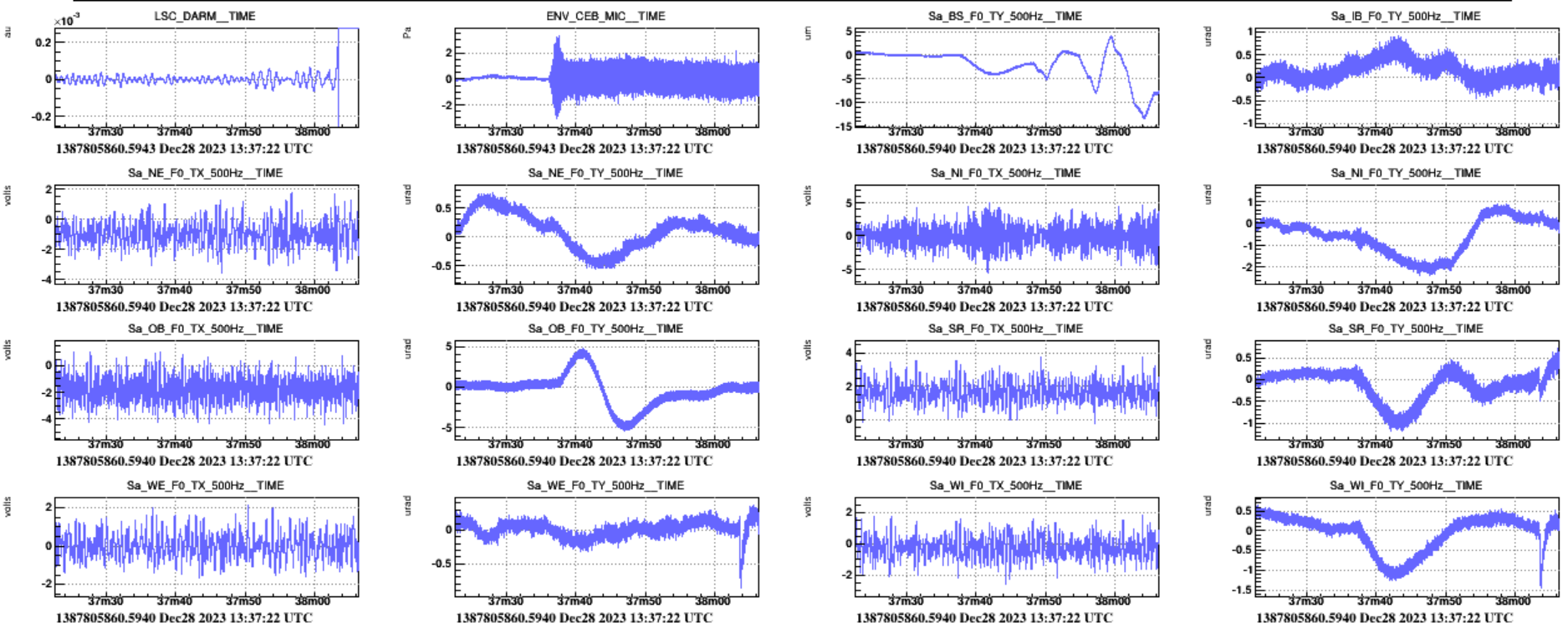 - at about 11:30 UTC, while injecting a magnetic sweep in the NEB. The ITF unlocked when the sweep frequency was at about 70Hz with an amplitude of 4V. It seems that we disturbed the SNEB, the noise seen in Hrec resembled scattering shoulders. Figures 3 and Figure 4